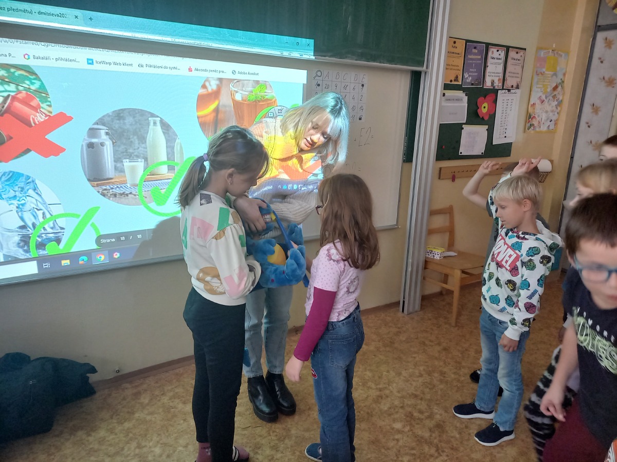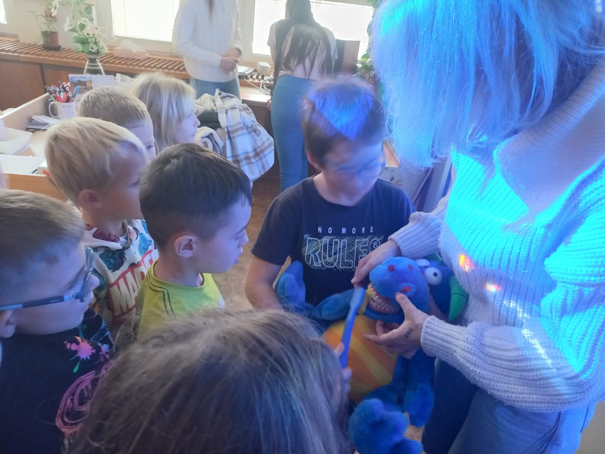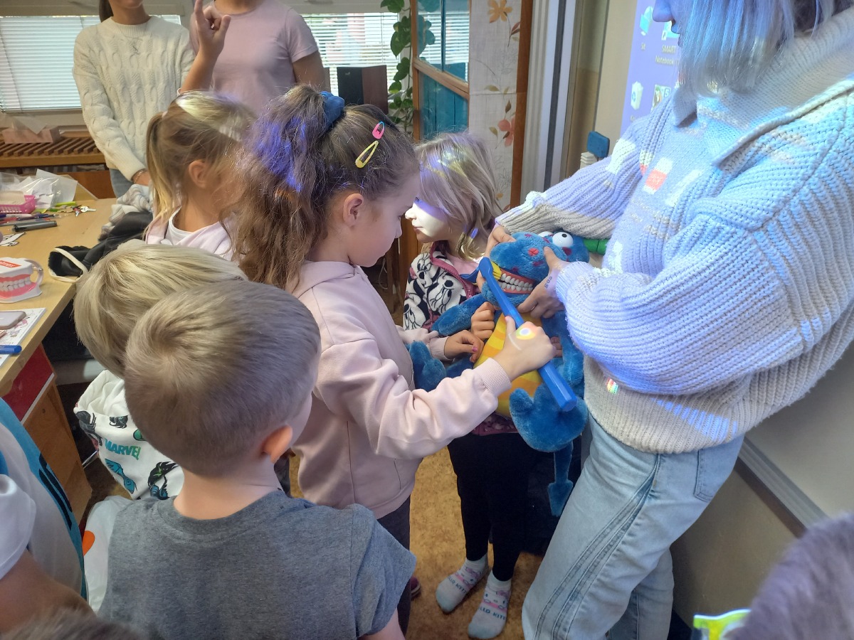 Umíte si čistit zoubky? Tak se nás ptaly studentky dentální hygieny, které nám přišly představit svůj obor. Zábavnou formou nás poučily o chrupu a péči o něj. Formou hry a soutěže jsme si uvědomili, které jídlo a pití je pro naše zuby zdravé a které máme omezit. Na závěr jsme vyčistili zuby plyšákovi a dostali malý dáreček.
