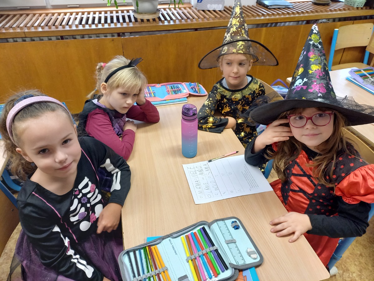 V naší třídě jsme si dnes užili Halloweenské vyučování. Nejprve jsme ve skupinách prováděli běhací diktát a kouzlem se naučili psát první slovo - mele. V matematice jsme počítali příklady ukryté v dýni. Zajímavý den jsme ukončili na hřišti, kde jsme hledali kouzelné bylinky k výrobě kouzelného lektvaru. Celý program jsme absolvovali oblečeni do strašidelných kostýmů.