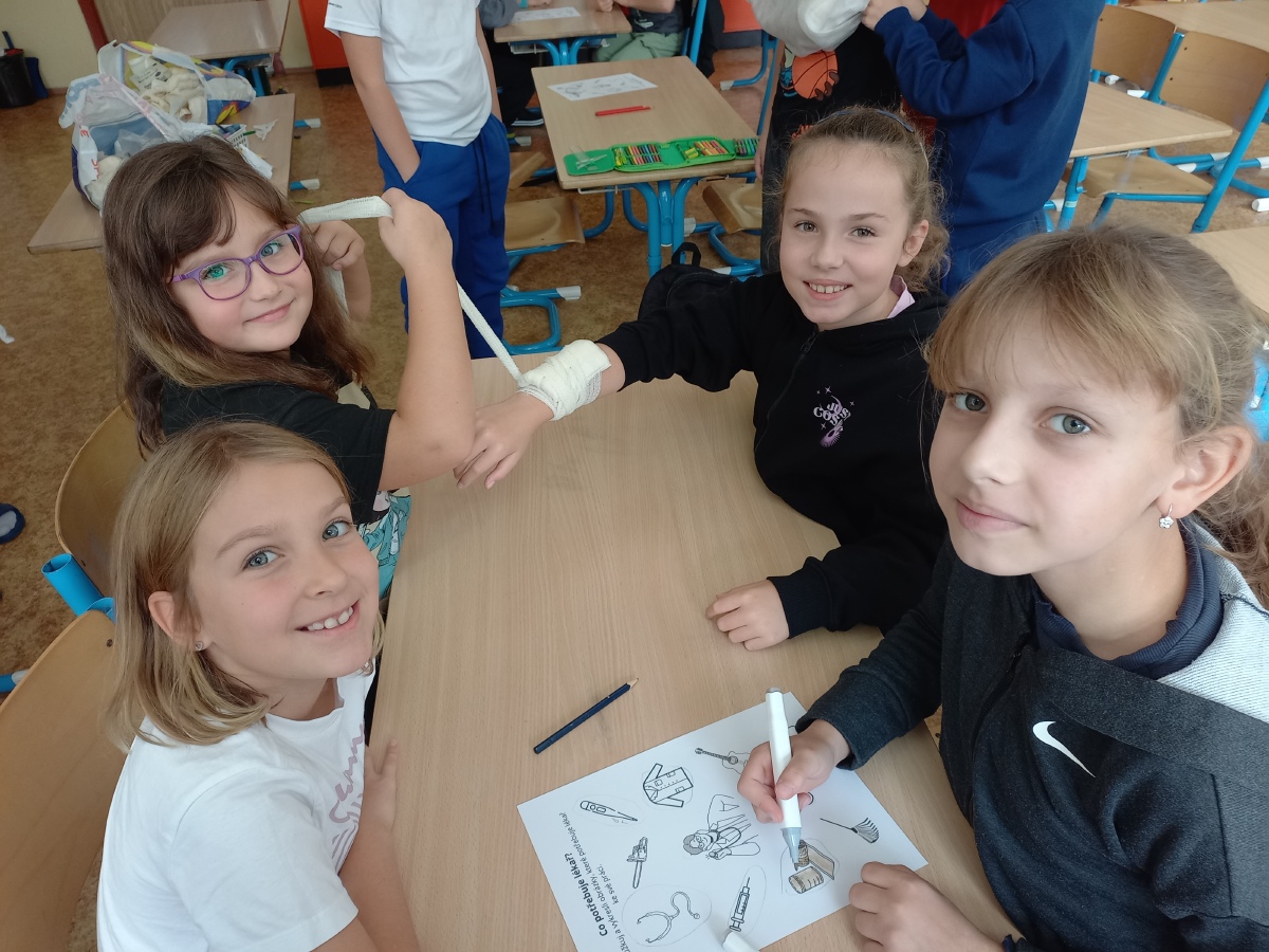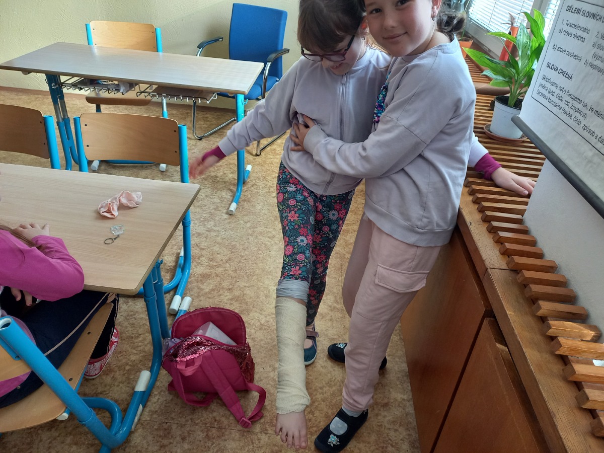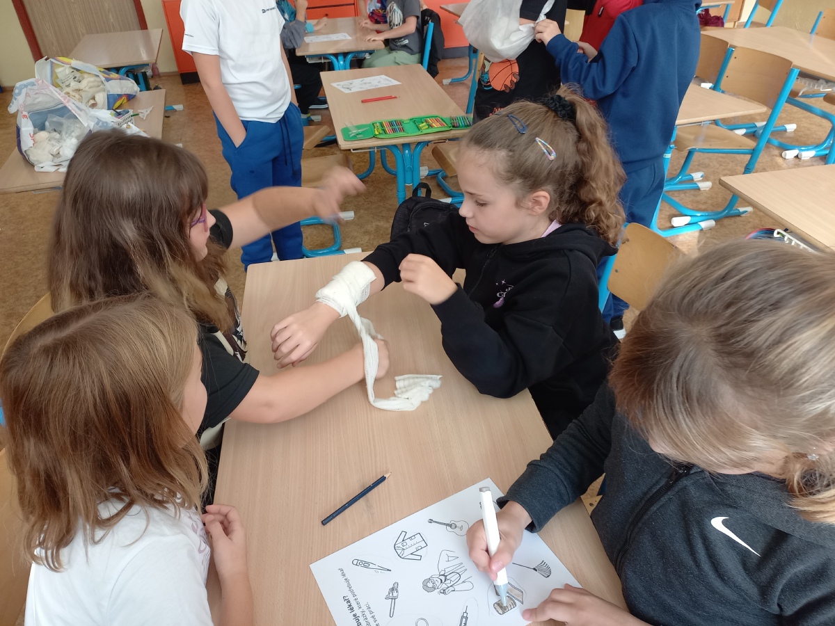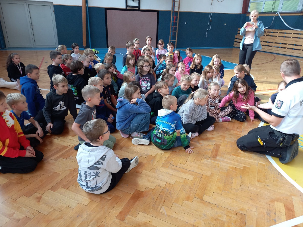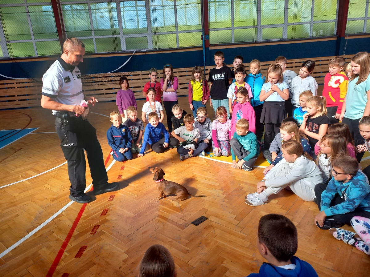 Ve čtvrtek 2.10. proběhl na naší škole sportovně branný den. Nejprve jsme po vyhlášení cvičného poplachu urychlene opustili školu. Po návratu jsme se věnovali činnostem, které nám mohou zachránit zdraví nebo i život při mimořídných událostech. V tělocvičně na nás čekal policista pan Krupička a dal nám opět spoustu dobrých rad, jak se chovat, aby se nám nic nestalo. Na závěr jsme se vydali na procházku a připomněli si některá dopravní pravidla.