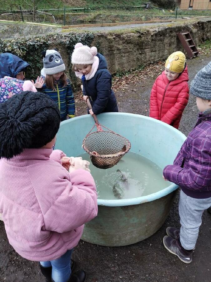 29.11.2024 jsme se byli podívat v rodinném rybářství Haering. Prvňáčci byli nadšení z procházky kolen rybníka, ze sádek s kapry a dokonce si mohli rybu z kádě vylovit a vzít do ruky. Na památku dostali šupinu.