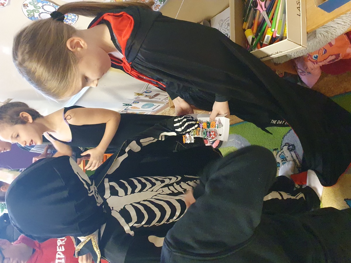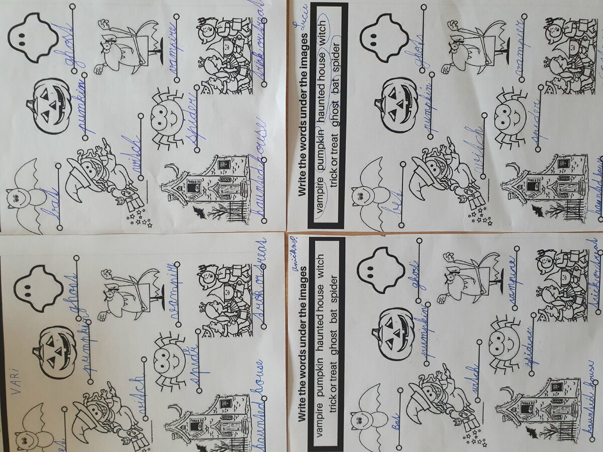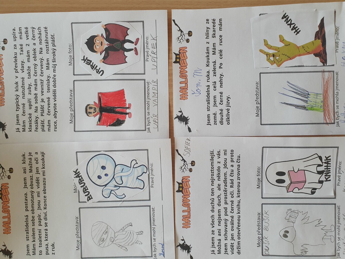 Ve čtvrtek 31. 10. přišly děti ze 3. B do školy v maskách. Celý den plnily halloweenské úkoly, poznávaly se podle strašidelných skřeků, luštily a počítaly strašidelnou násobilku, četly o monstrech, která následně kreslily i hledaly na koberci, na závěr dne dostaly diplomy. Děti si zasloužily velikou pochvalu i za to, že přinesly pro ostatní halloweenskou dobrůtku a dokonce i dárečky pro celou třídu - svítící prsteny.