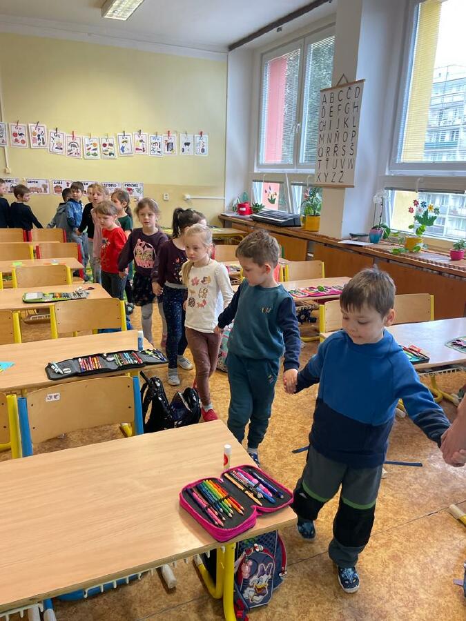 Ve čtvrtek nás ve třídě navštívili předškoláci z Mateřské školky Sedmikráska. Děti se společně naučily 2 říkanky - O jaru a O myšce, procvičily si společně písmena, počítání i geometrické tvary. Předškoláci si vyrobili a odnesli domů na památku myšky, které s pomocí našich prvňáčků poskládali a slepili z geometrických tvarů