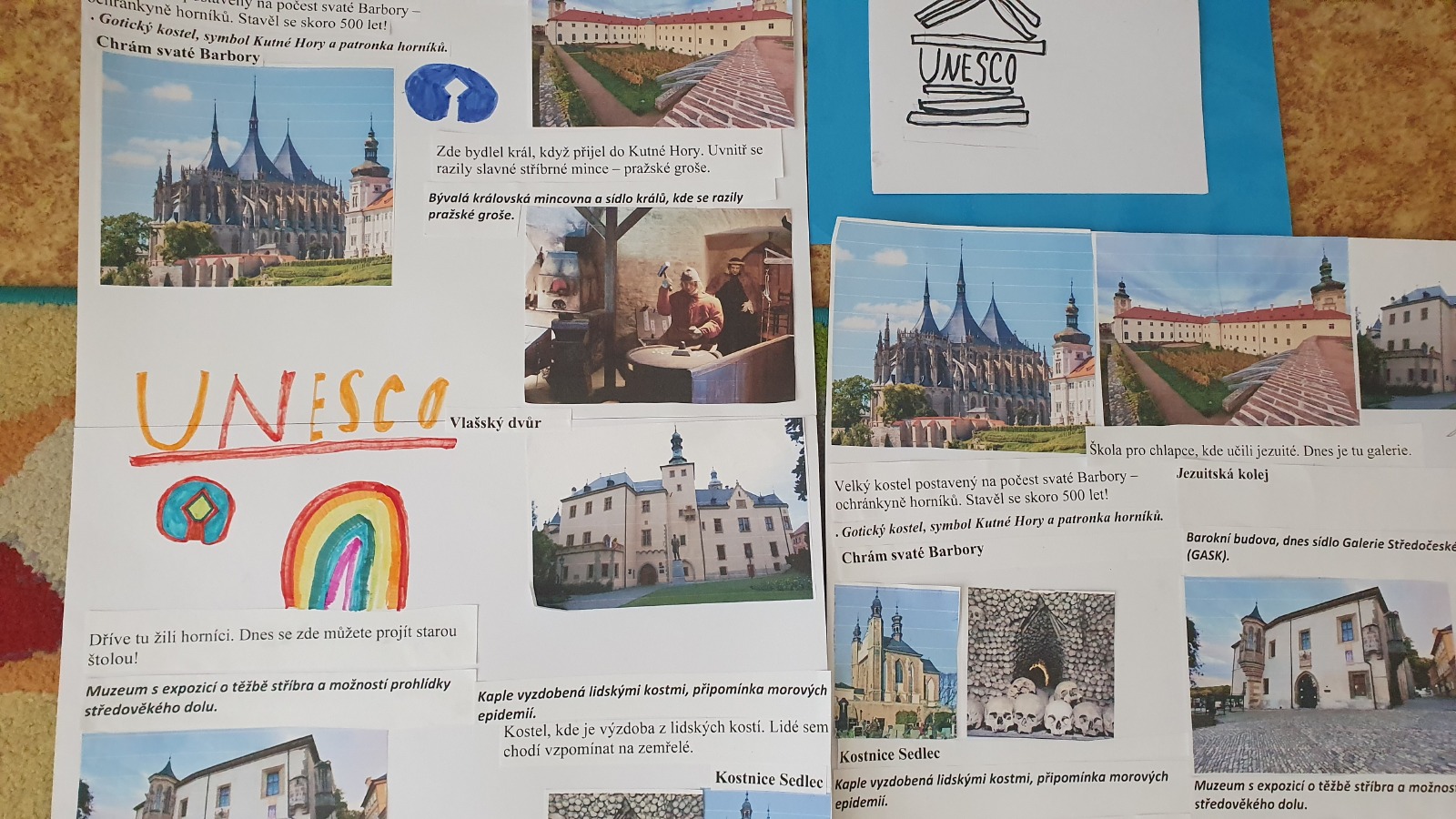 Třeťáci tento týden zahájili projekt UNESCO návštěvou Dačického domu, kde se od paní lektorky dozvěděli mnoho zajímavých informací nejen o Kutné Hoře, ale i o památkách UNESCO v celé České republice. Dnes své znalosti zužitkovali během projektového dne, dozvěděli se, co znamená zkratka UNESCO v angličtině, připomněli si, jaké památky jsou v Kutné Hoře, poznávali a vzpomínali, které všechny kutnohorské památky společně již navštívili. Při práci ve skupinkách si připomněli, co vše již o Kutné Hoře vědí a v jakém krásném městě žijí.
