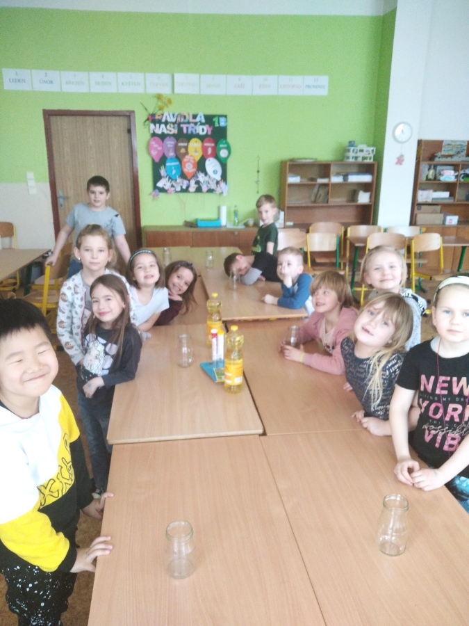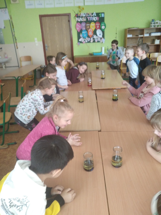 Díky pokusu s vodou, olejem a potravinářským barvivem, žáci zjistili, že kapaliny mají různou hustotu. Na závěr objevili kouzlo chemické reakce oxidu uhličitého s kapkami vody při vhození šumivé tablety do sklenice.