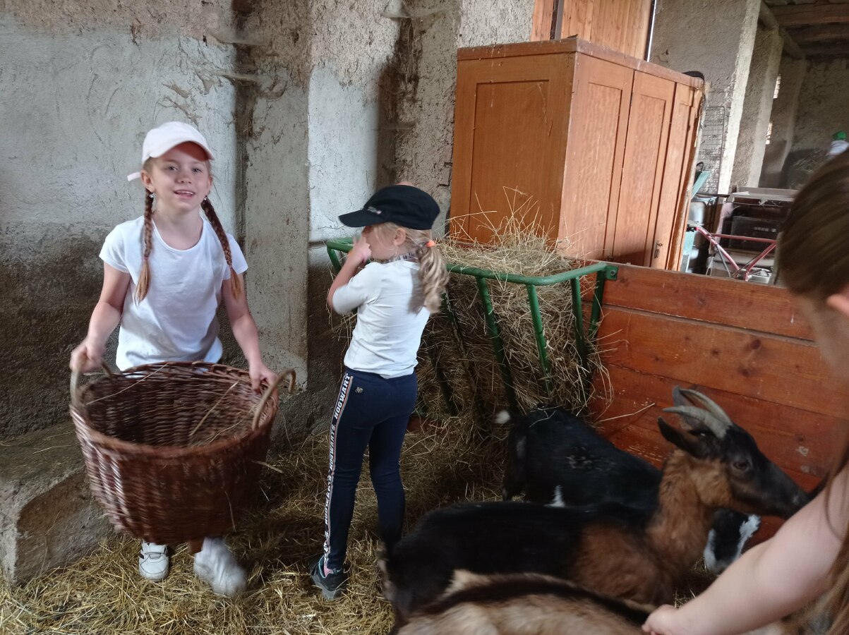 U babičky na dvorečku jsme poznávali hospodářská zvířata (ovce, kozy, prasátko, králíky, slepice, husy, kachny, kuřátka, kachňátka), nechyběla ani morčátka či nutrie. Opodál jsme viděli také lamy a oslíka. Téměř všechna zvířátka jsme si mohli pohladit, ale také jsme se učili o ně postarat.