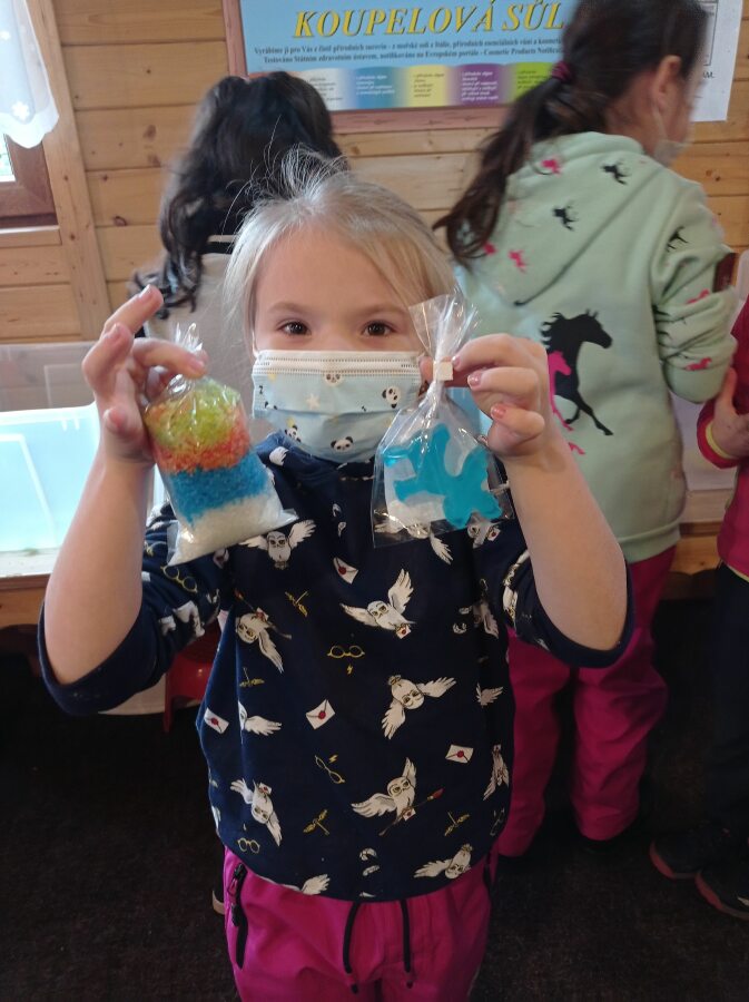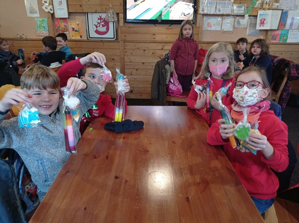 Tam nás čekal bohatý program. Naučili jsme se barvit svíčky, vykrojili jsme si glycerinové mýdlo a naplnili balíček vonné koupelové soli. ![]()