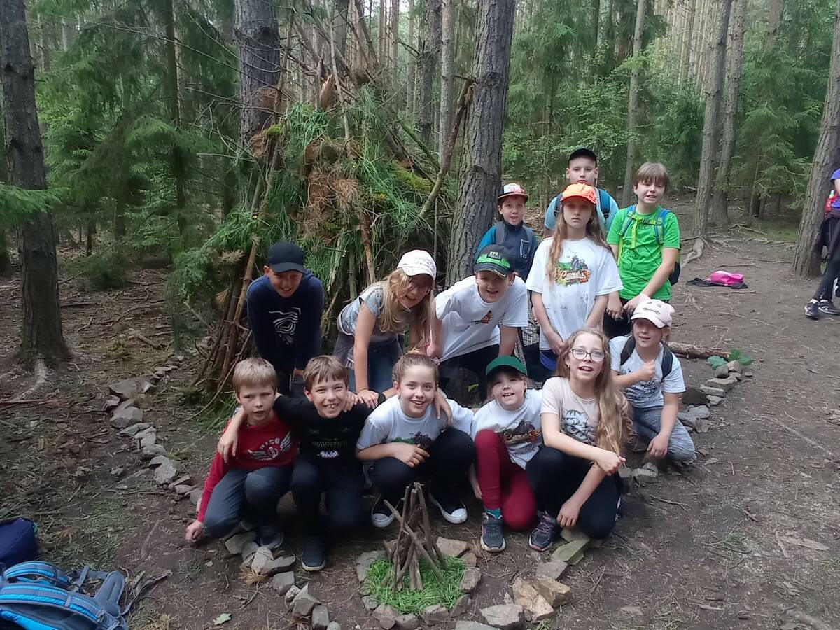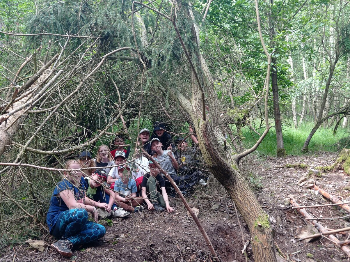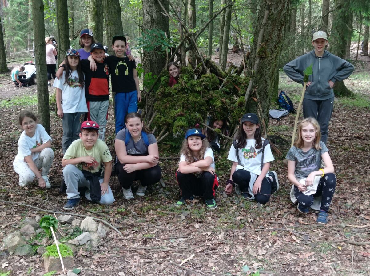 Po dnešním dopoledním učení jsme se vydali na celé odpoledne do lesa. Tam nám animátorky daly za úkol postavit v týmech lesní příbytek tak, aby se do něho schoval alespoň 1 člověk. Samozřejmě jsme nic nelámali, netrhali ani neničili.