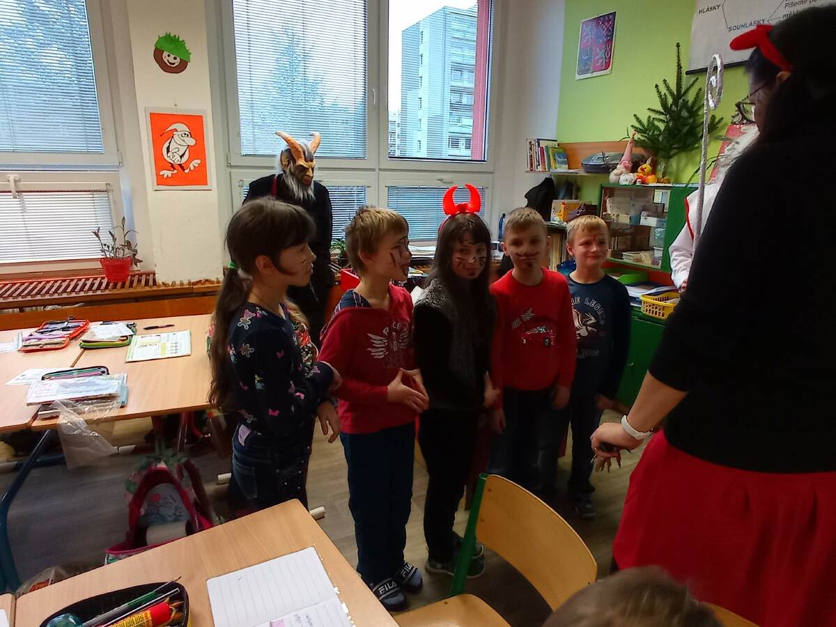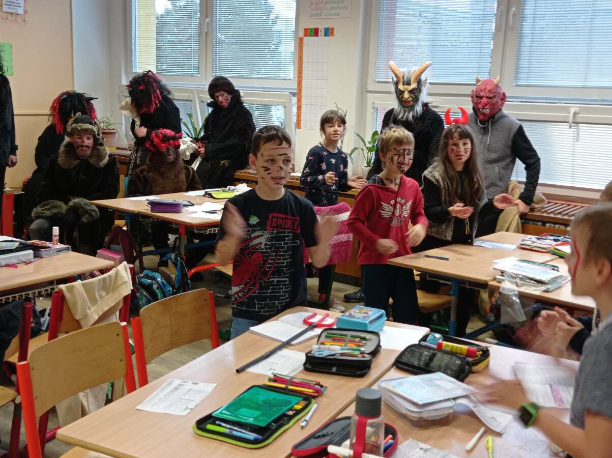 se svou družinou. Od rána to ve škole znělo zvonky, rolničkami, ale také čertovským brbláním a řetězy.