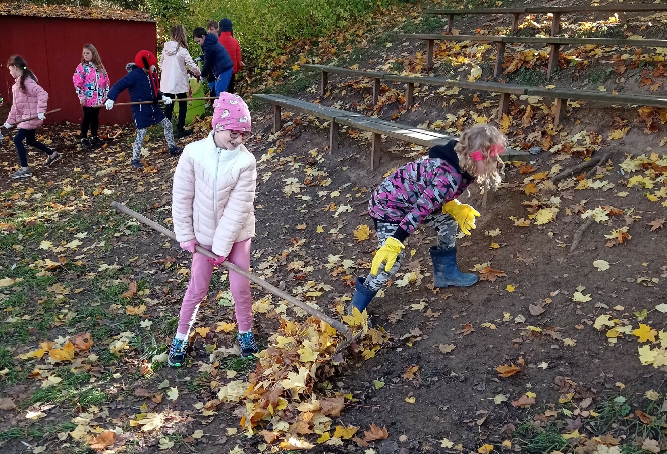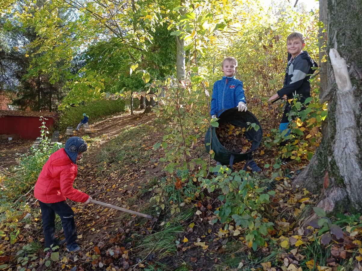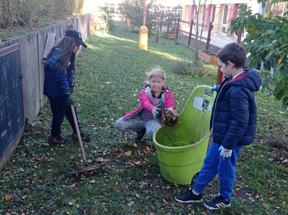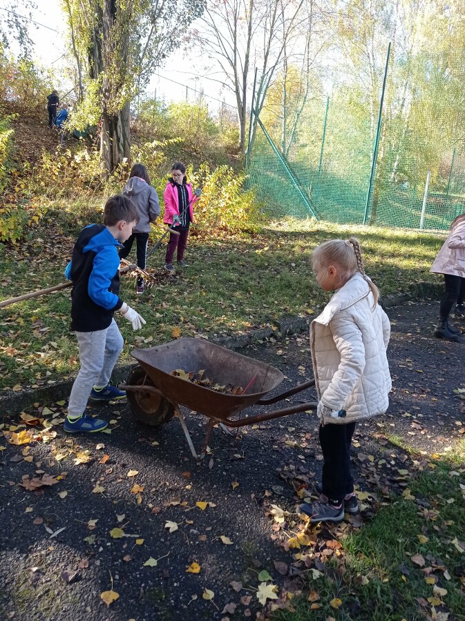 Na konci října jsme se oblékli do pracovního, nasadili rukavice a vypravili se pomoct uklidit okolí naší školy. Hrabali jsme listí, zametali chodník, nakládali kupky listí do košů a koleček a odváželi na určené místo. Všichni se pustili s chutí do práce a to byste koukali, jak nám to šlo pěkně od ruky!