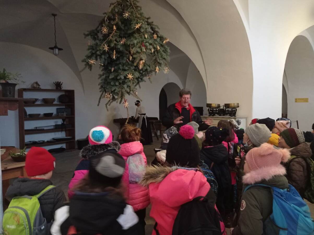 Potom jsme se vrátili do minulosti a poznávali jsme, jak se dřív slavily Vánoce na zámku. Podívali jsme se do kuchyně, kde se připravovaly dobroty na štědrovečerní tabuli. Zavítali jsme i ke stolu a ke stromečku s tehdejšími dárky.