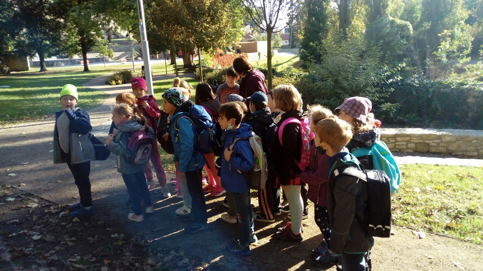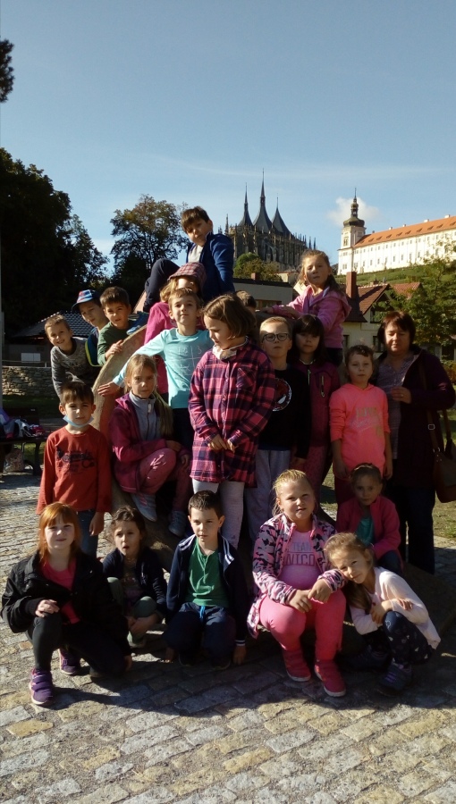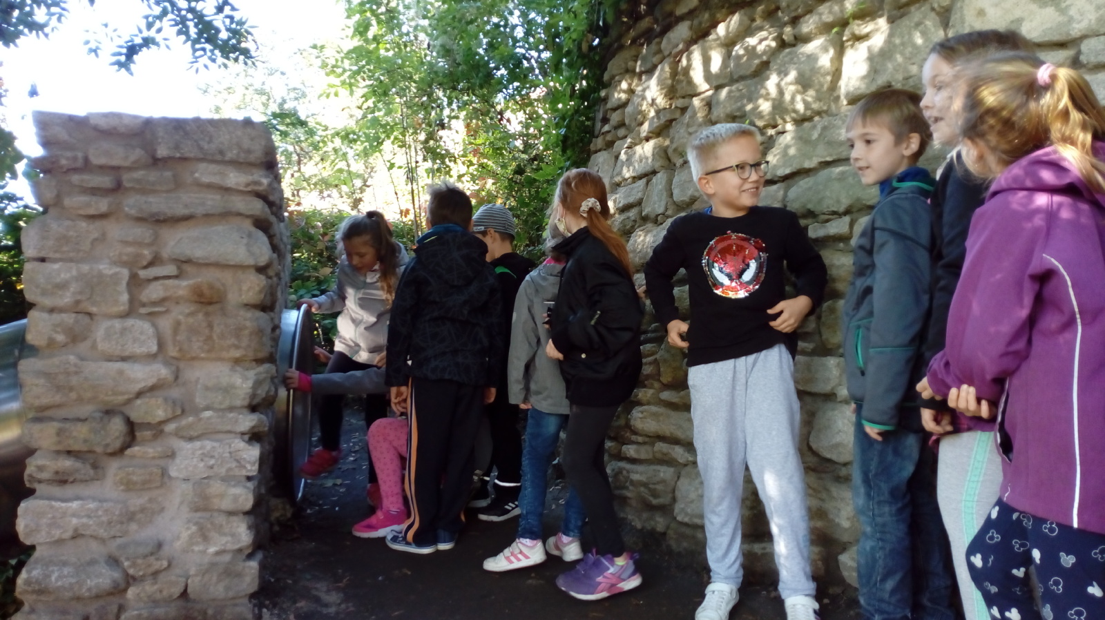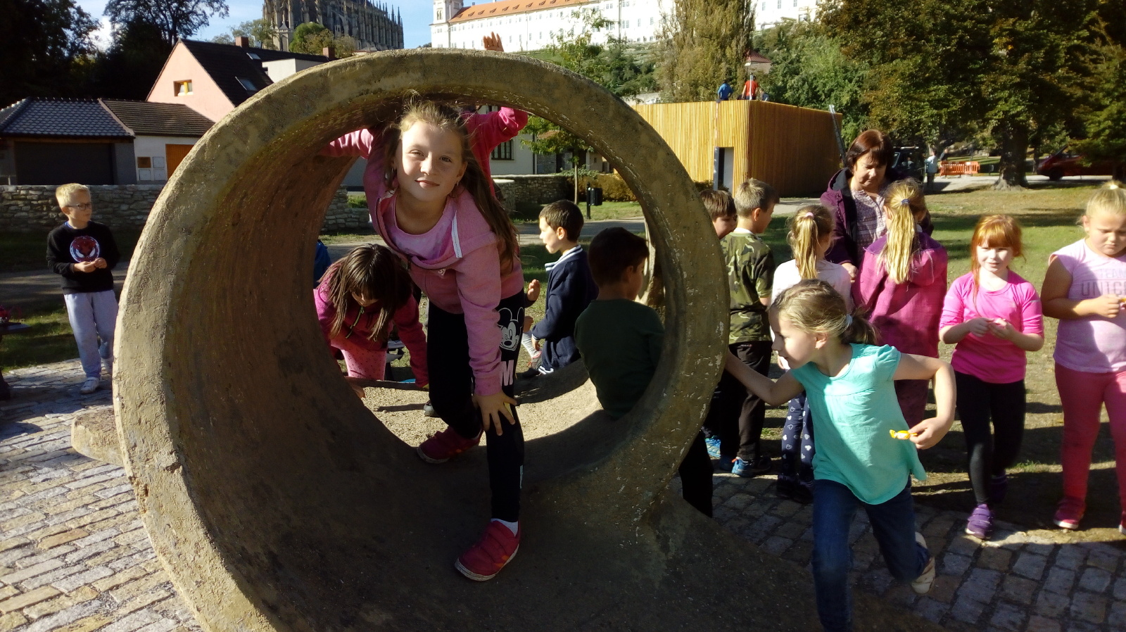 Hned po vyhlášení cvičného poplachu jsme opustili školu a zamířili na Královskou procházku. Tam jsme se na nové vyhlídce nasvačili šli jsme se podívat, kde je vstup do pekla. Nikoho si tam čerti nenechali a tak jsme seběhli k opravenému parku Pod Vlašským dvorem. Objevili jsme tam úžasnou skluzavku, kterou bylo nutno pořádně vyzkoušet! Cestou ke škole jsme se ještě stavili v parku Na náměti, kde byla spousta kaštanů, které děti vysbíraly.