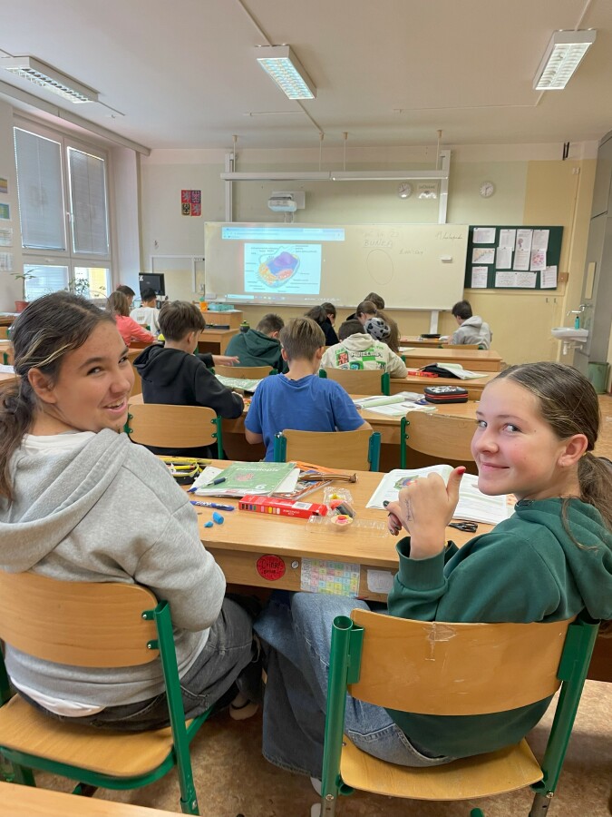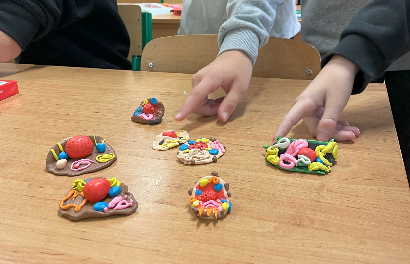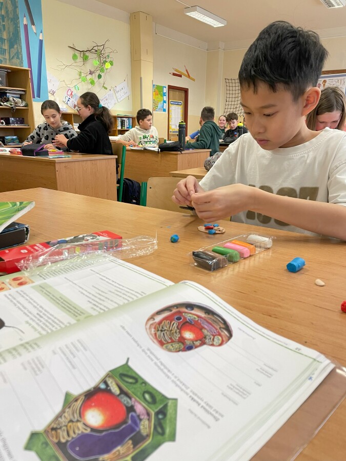 A je to tu! Tedy, bylo to tam - v 6.B! Přírodopis a téma "buňka a její stavba". Každý se s tím trochu potrápí, neboť ví, že buněk je několik druhů a ty mají různé organely. My jsme si tentokrát vyzkoušeli vymodelovat buňku živočišnou a zapojili jsme nejen šikovné mozkové závity, ale i šikovné ruce. Nejen, že se výsledek náramně povedl, ale na konci hodiny si už všichni uměli sami zhotovit nákres s popisem buňky do sešitu bez pomoci učebnice a bez nápovědy. Dobrá práce!