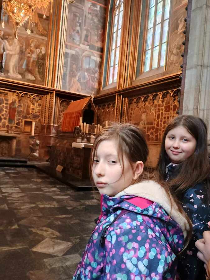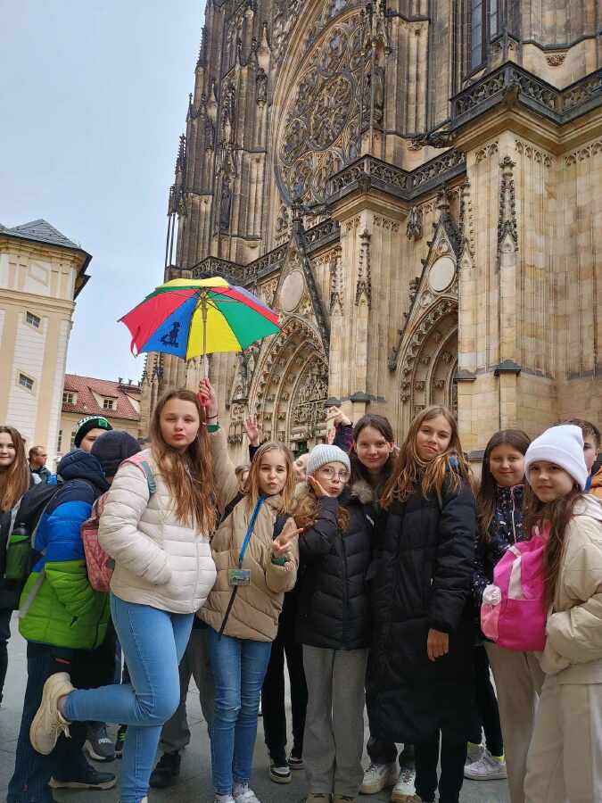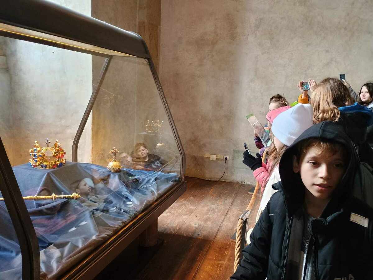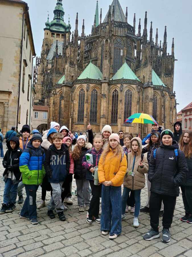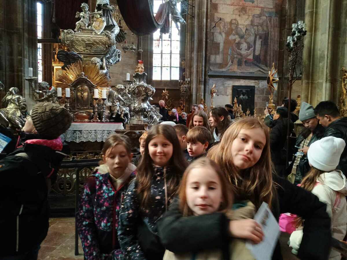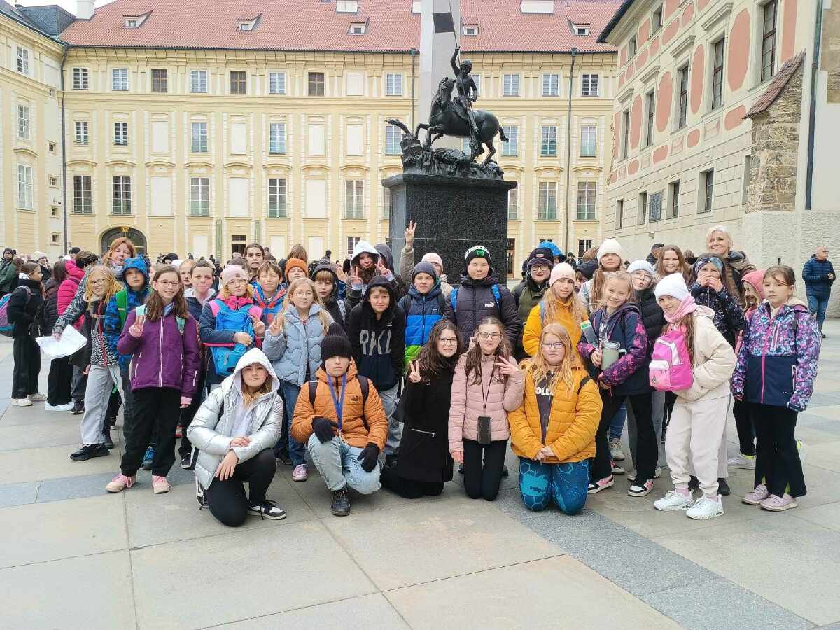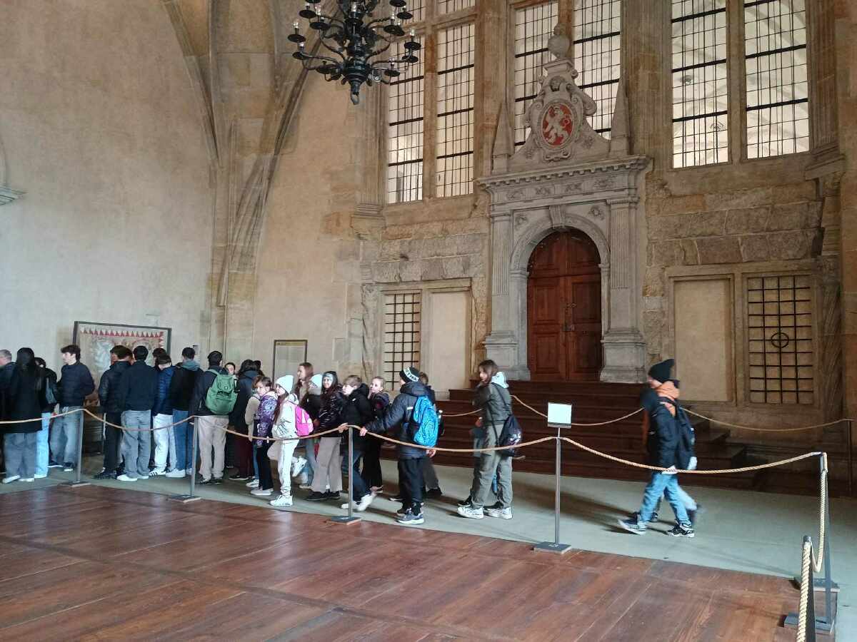 Přes Lví dvůr jsme severní branou prošli II. nádvořím na nádvoří III., kde naší první zastávkou byla prohlídka gotické katedrály sv. Víta, Václava a Vojtěcha. V chrámové lodi jsme si prohlédli také kapli sv. Václava, připomněli jsme si první Přemyslovce a jejich příběhy, ukázali jsme si místo, kde se nacházejí korunovační klenoty českých králů. Na III. hradním nádvoří jsme se ještě zastavili u gotické bronzové sochy sv. Jiří, který zde již po staletí bojuje s drakem, u Mrákotínského obelisku, památníku padlým z 1. sv. války, a pokračovali jsme do Starého královského paláce - prohlédli jsme si pozdně gotický Vladislavský sál s renesančními okny i kopii korunovačních klenot. Starými jezdeckými schody jsme opustili královský palác a zamířili do baziliky svatého Jiří - uvnitř nás přivítala jednoduchost románského slohu, zavzpomínali jsme na Václavovu babičku, svatou Ludmilu, která zde má svou vyzdobenou kapli. Propletli jsme se úzkou Zlatou uličkou, barevnými domečky hradních střelců a zlatníků až k věži Daliborka, kde jsme se s naší minulostí rozloučili.