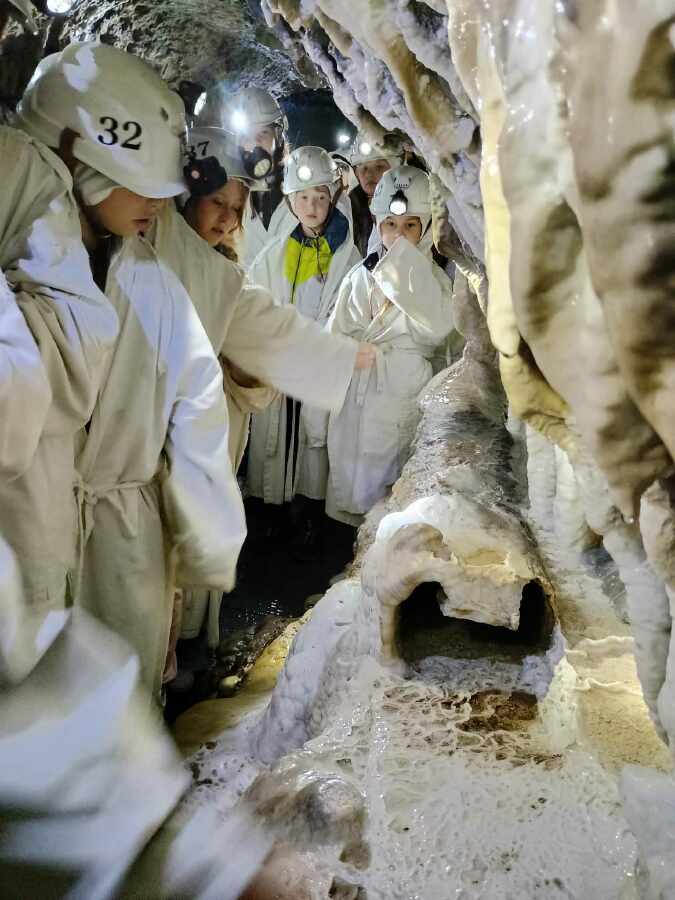 Seznámili jsme se s historií těžby stříbra od 13 do 16. století, připomněli jsme si pověst o objevení tří stříbrných prutů sedleckým mnichem Antoněm, prohlédli jsme si vzácný důlní stoj ze 16. století - dřevěný trejv neboli žentour, sloužící k přepravě těžkých nákladů z velkých hloubek, který pohánělo šest párů koní, dozvěděli jsme se mnoho zajímavostí z nelehkého života kutnohorských horníků, o jejich těžké práci s primitivními nástroji (mlátkem a želízkem, železným klínem) v úzkých, temných, vlhkých chodbičkách, v hloubce až 500 metrů. Také my jsme následně zažili v odvodňovací štole sv. Jiří, jak je to nepohodlné, když místem vysokým 120 cm nebo širokým 40 cm, v hloubce „pouhých“ cca 30 metrů - jen procházíte. Naštěstí jsme měli s sebou Barborku a také na hlavách přilby se světly a na sobě bílé perkytle, havířská haleny s kápí, takže naše „stříbrné dobrodružství“ dobře dopadlo.![]()