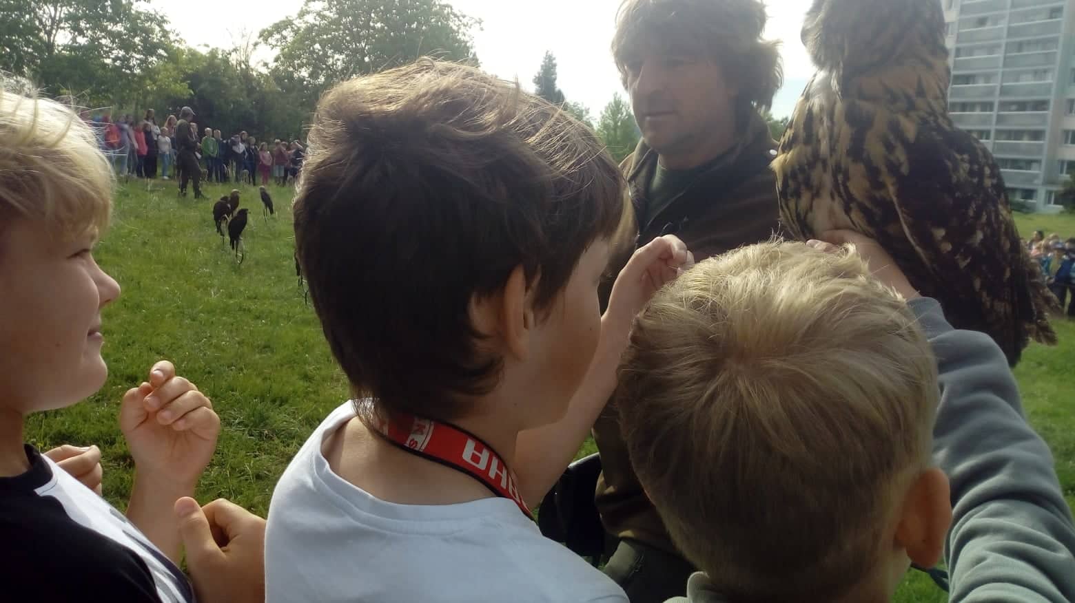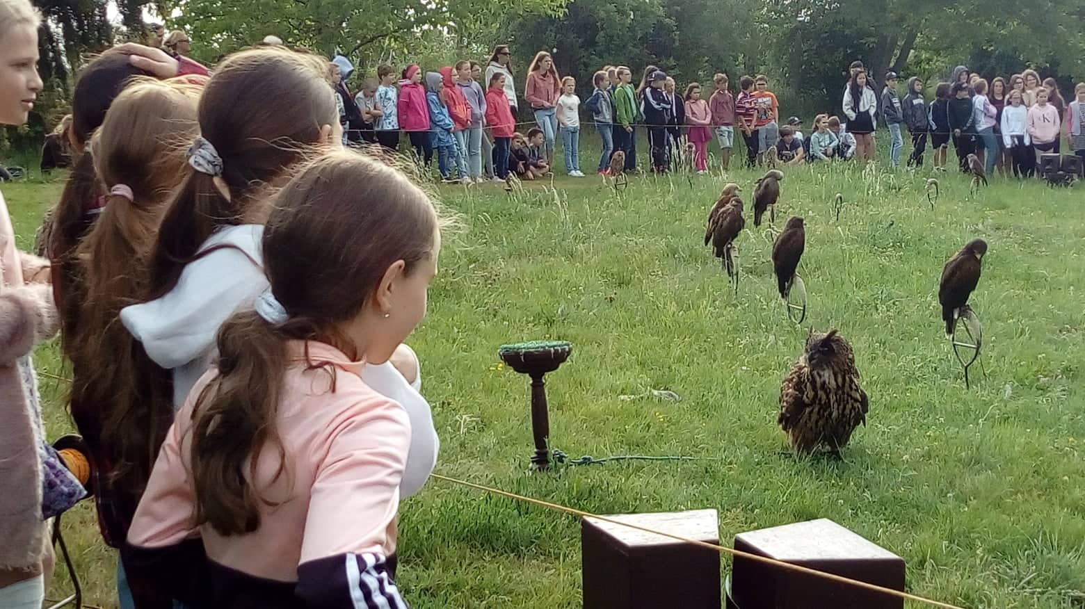 Při setkání s našimi dravci jsme se nejen poučili, ale i pobavili. Viděli jsme ukázku lovu některých dravců, pozorovali jsme výra velkého, orla mořského evropského i amerického, krkavce, supa bělohlavého, káně, krahujce, jestřába, poštolku, pohladili jsme si sovu. Byli jsme upozorněni, že dravci se dostávají vinou lidí do nebezpečných situací - hynou v elektrických drátech, v plotech, nárazem do oken.