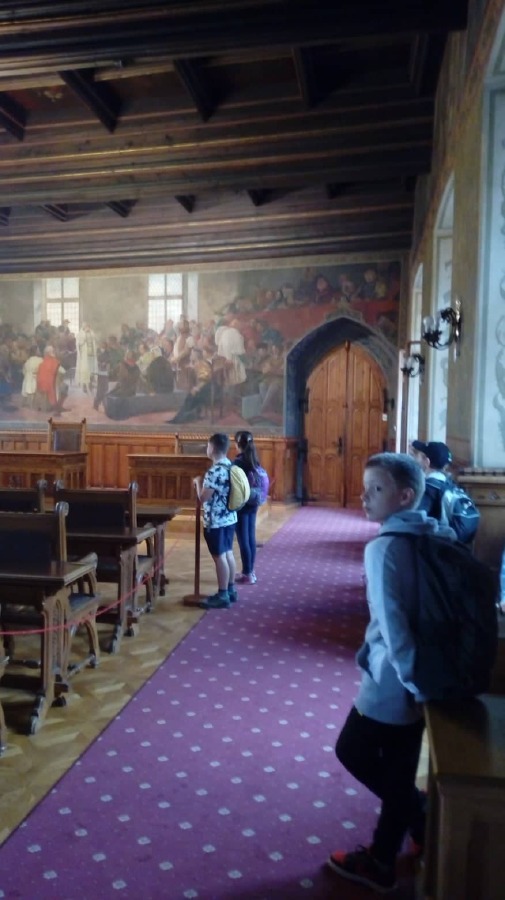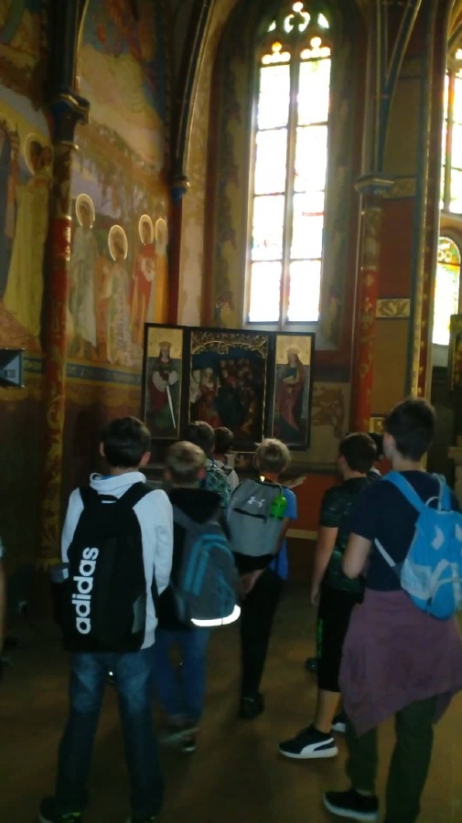 8. června jsme se vydali do Vlašského dvora na 3. prohlídkový okruh - přivítal nás královský palác, komnaty, ve kterých se nachází výstava filmových rekvizit, a královská kaple. Dozvěděli jsme se něco z historie zdejší radnice, prohlédli jsme si její výzdobu, připomněli jsme si české krále z rodu Přemyslovců a Lucemburků, Václava II. a jeho měnovou reformu, Karla IV. a Pražskou univerzitu, Kutnohorský dekret a Mistra Jana Husa, s naším středověkým miniputováním jsme se rozloučili pod gotickou klenbou krásně zdobené kaple sv. Václava a Ladislava.