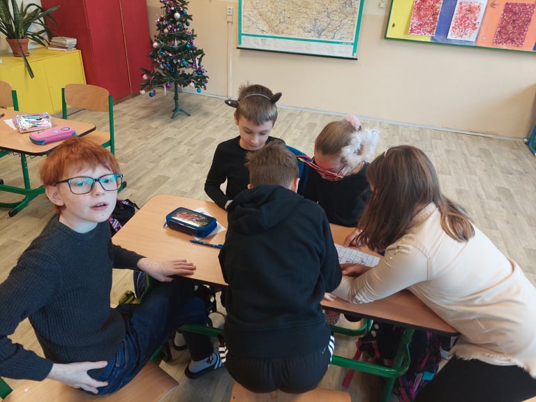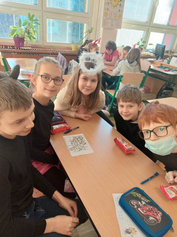 V pátek 3. 12. jsme si přichystali čertovské dopolední vyučování. Přinesli jsme si masky, vyplňovali popletené dopisy od čerta, za pomocí příkladů skládali čertovský obrázek, zahráli si postřehovou hru- čertovskou řetězovku a dozvěděli se legendu o svatém Mikuláši. Netrpělivě jsme čekali, až nám na dveře zaklepe Mikuláš. Mikuláš přijít nemohl, ale na místo sebe poslal krásného anděla s čertem. Den jsme si moc užili.