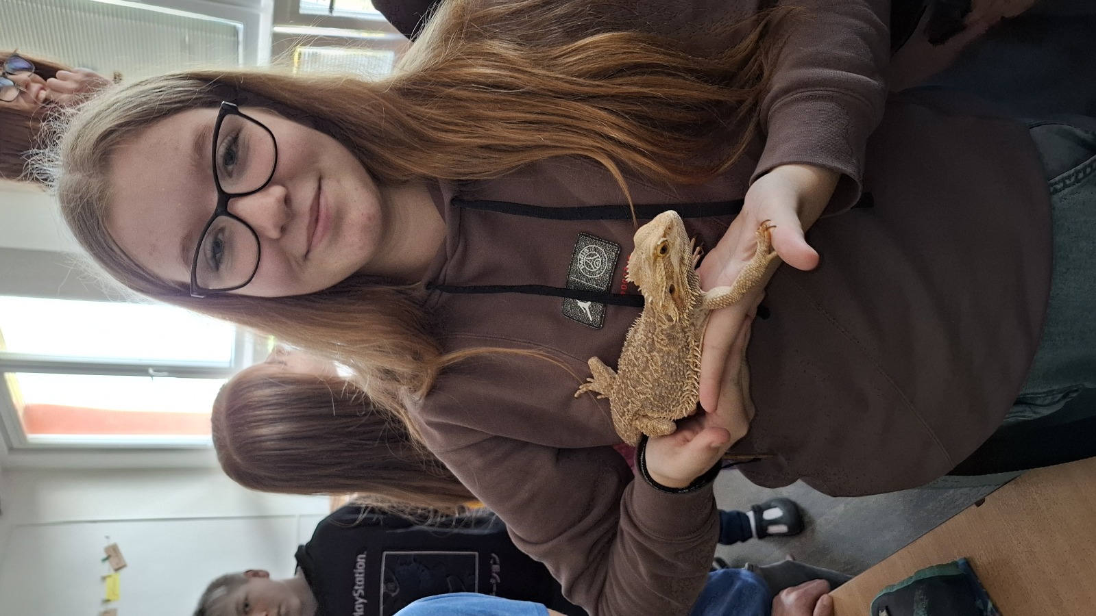 Ještě před Vánoci zažili žáci 7.B v hodině přírodopisu nevšední návštěvu. Martin přinesl svého mazlíčka – agamu vousatou. Během hodiny jsme se dozvěděli spoustu zajímavostí o jejím způsobu života, chovu a péči, kterou tento exotický plaz potřebuje. Martin přinesl i červíky na ukázku krmení, což vzbudilo velký zájem i trochu odvahy.