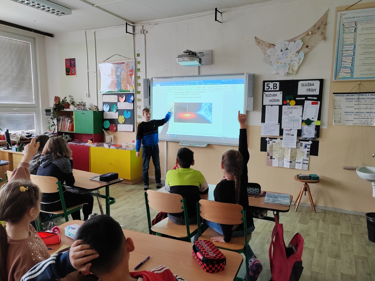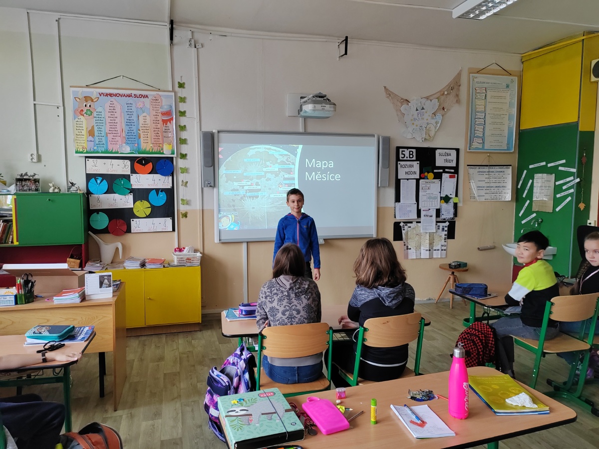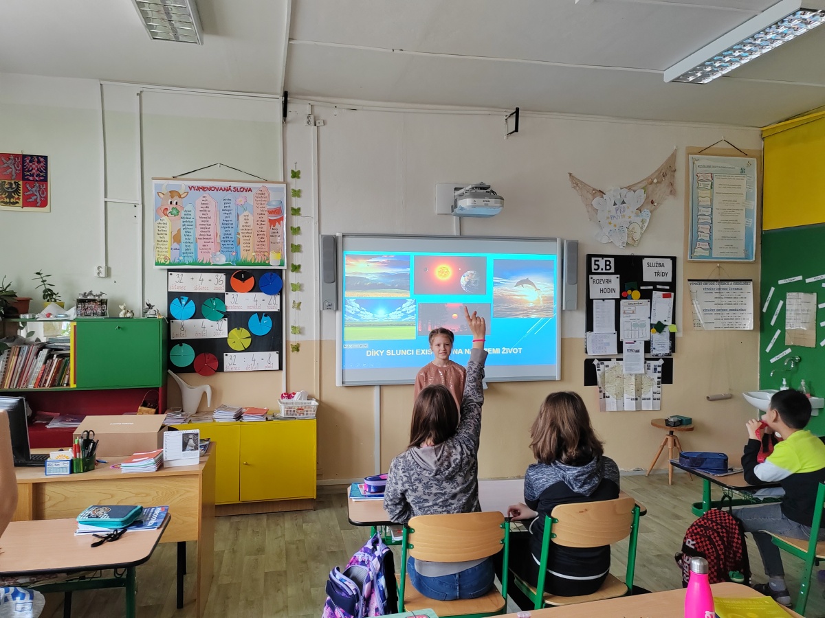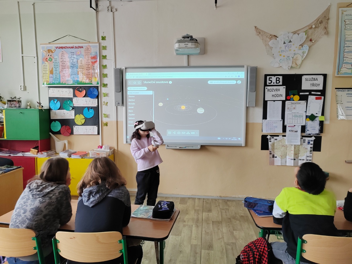 V hodině přírodovědy měli žáci za úkol připravit si referát na téma Vesmír. Jelikož je jim toto téma blízké, referáty měly opravdu vysokou kvalitu a zhlédli jsme i pár povedených prezentací. Za odměnu si poté mohli prohlédnout model naší Sluneční soustavy ve virtuální realitě.