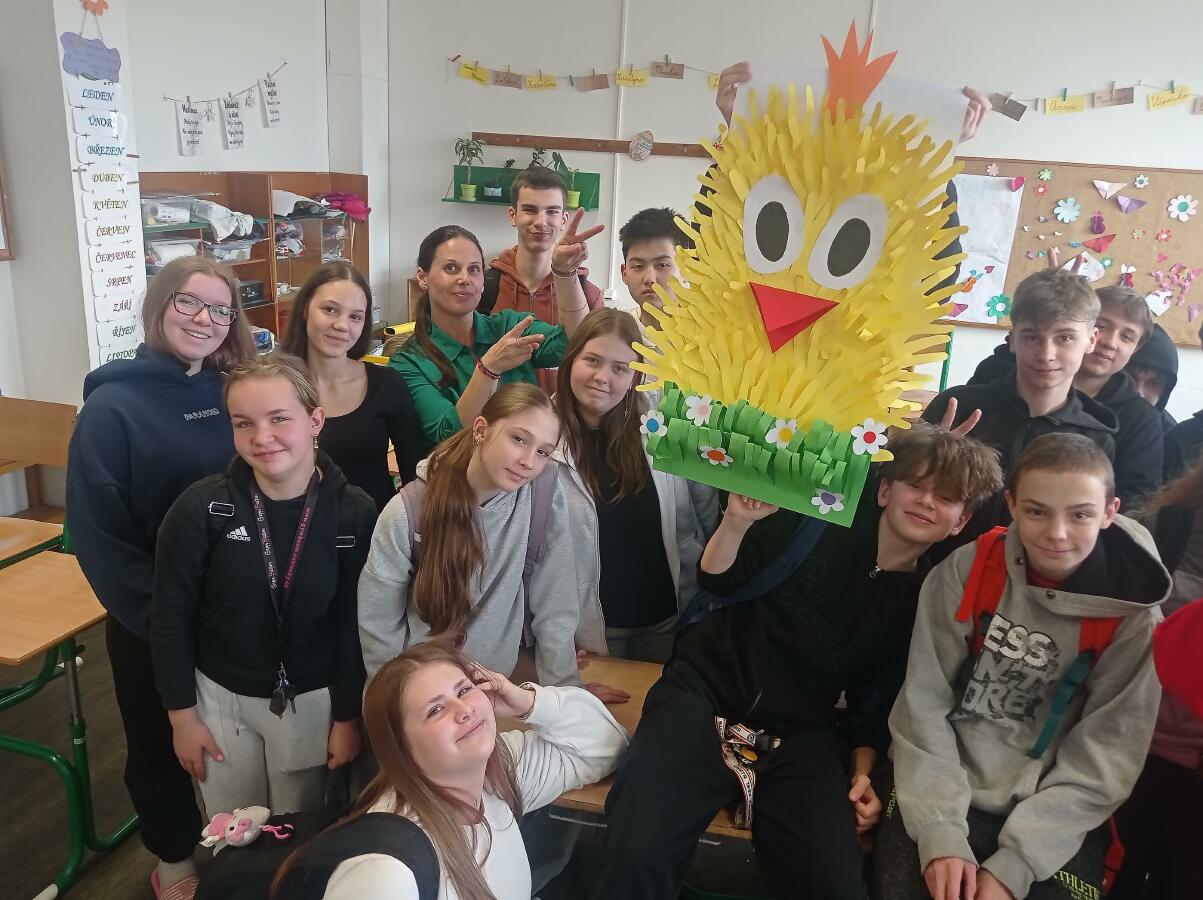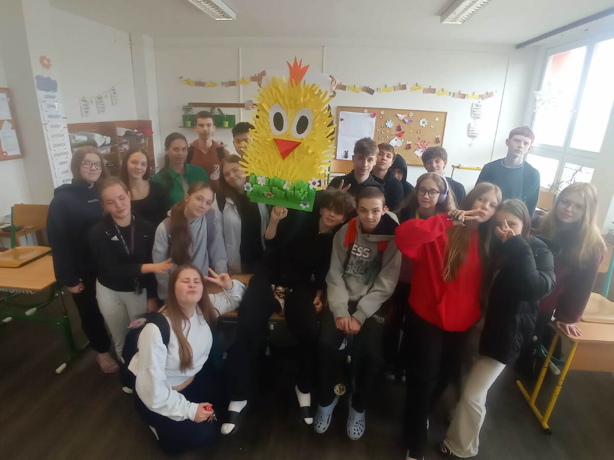 Na Velikonoce si žáci 8.B vyzdobili dveře své třídy krásnou společnou velikonoční dekorací. Každý přispěl k tomu, aby se "narodilo" roztomilé velikonoční kuřátko.
