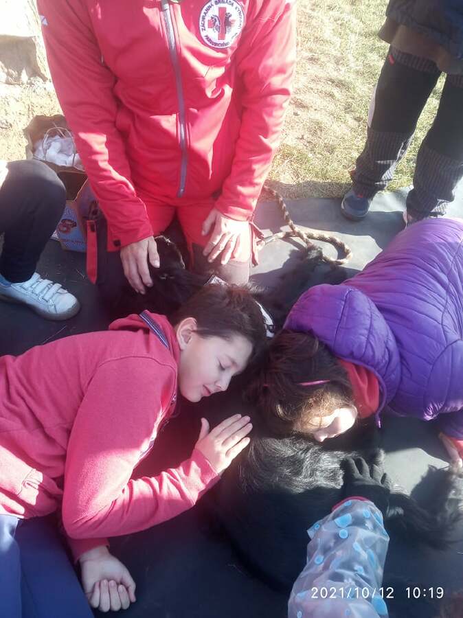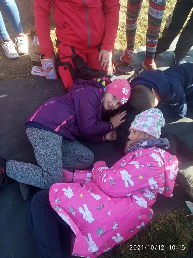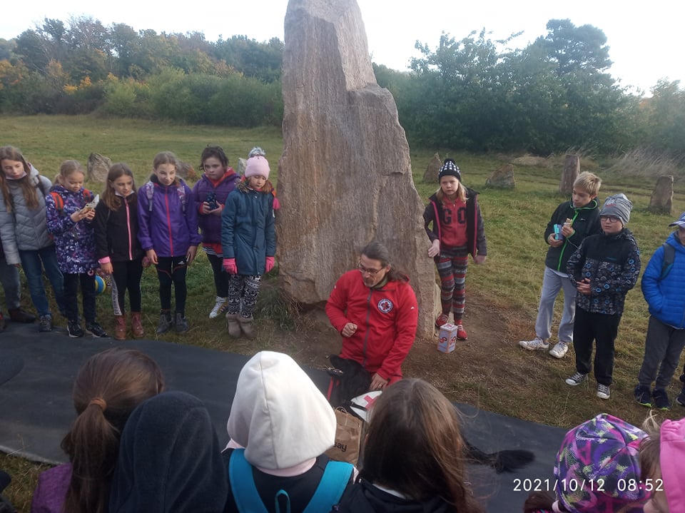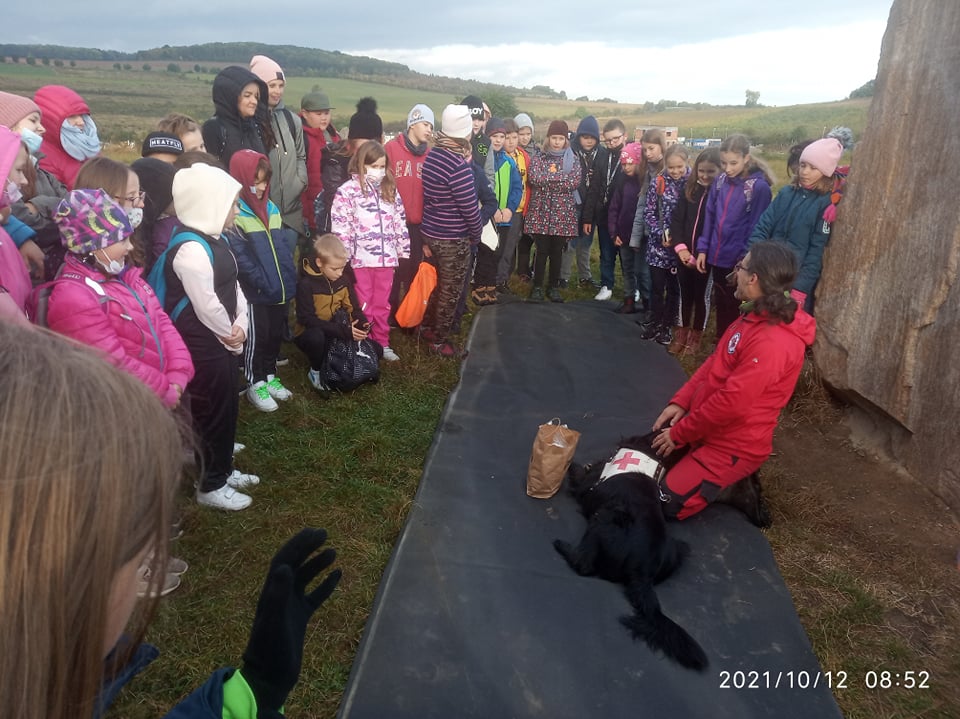 Dne 12.10.2021 proběhl na naší škole Branný den. Všechny třídy se po vyhlášení poplachu shromáždily na prostranství nedaleko školy a poté se odebraly splnit svůj pracovní plán. 5. ročníky si naplánovaly pochod na nedaleké Menhiry, kde na nás čekal psovod se svou canisterapeutickou fenkou Frejou, která nám dělala celé dopoledne milou společnost. Dozvěděli jsme se spoustu zajímavostí o pravidlech první pomoci nejen u lidí, ale i u zvířat. Fenka nás ohromila svoji trpělivostí a přítulností, a tak nás nechala, abychom si osobně vyzkoušeli, jak probíhá canisterapie. Děti se po Freje mohly naprosto s důvěrou poválet, nechala si od nás zavázat tlapky a někteří odvážlivci si nechali odejmout pamlsek přímo ze rtů. Počasí se vydařilo, i když sluníčko nás moc nezahřálo, ale nadšení dětí všechny tyto nesnáze dostatečně vynahradilo.