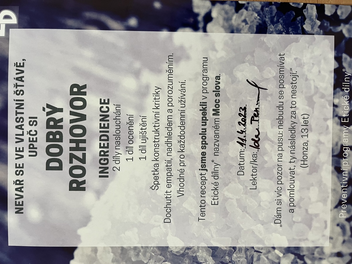 Žáci byli seznámeni a poučeni o tom, co všechno mohou pouhým slovem způsobit a že by měli přemýšlet, než něco řeknou, protože někdy to již nelze vzít zpátky. Během 2 vyučovacích hodin, proběhlo i mnoho zajímavých her a aktivit.