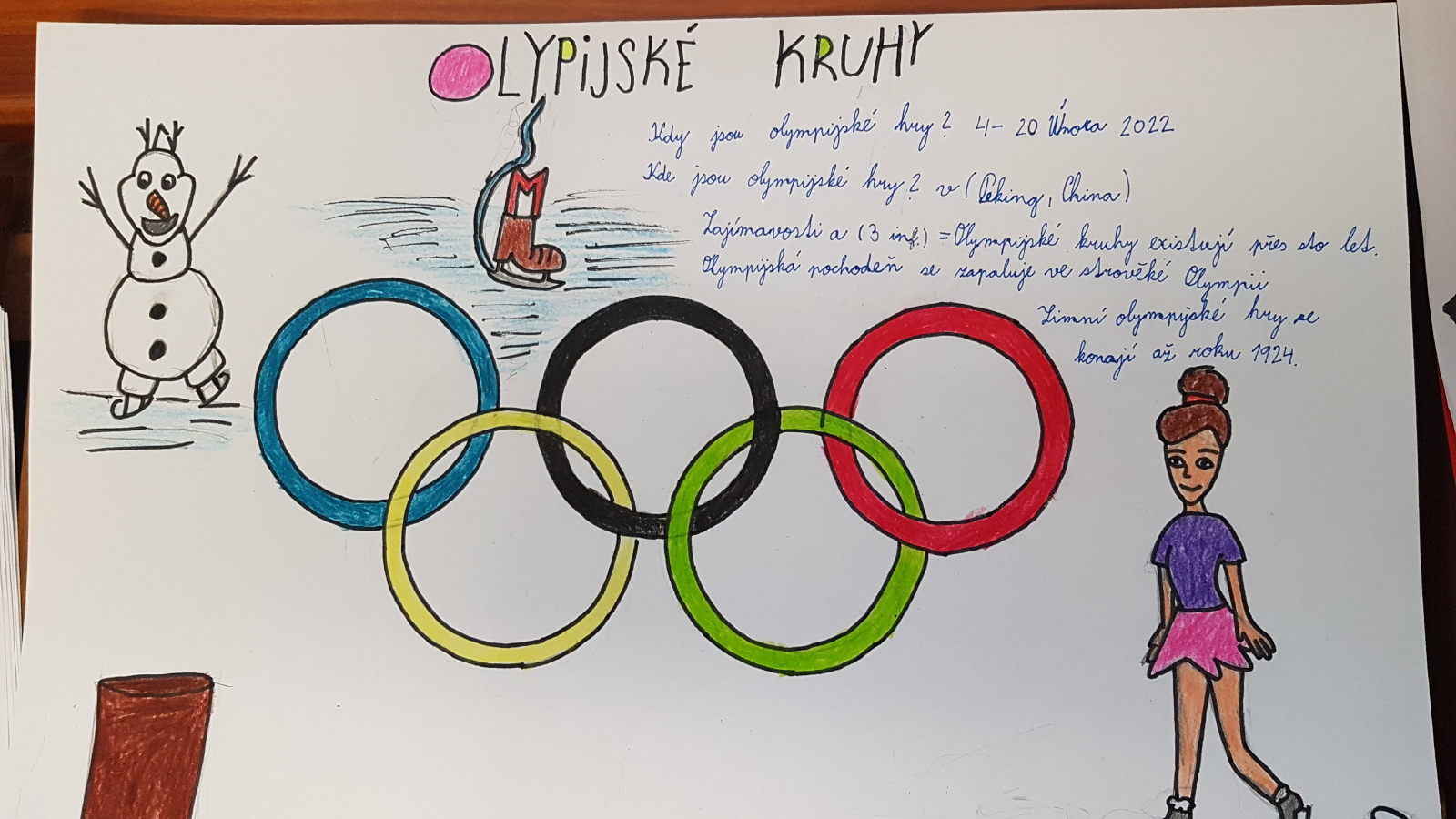 V pátek před vysvědčením věnovali páťáci celý den sportům. Na začátku dne jsme se naladili sledováním upoutávek na Zimní olympijské hry v angličtině i zajímavostmi z různých sportovních oblastí. Dále děti k olympijským hrám zjišťovaly na noteboocích nejdůležitější informace a tvořily ve skupinkách tematické plakáty. Závěrem dne děti vyběhly ven a zúčastnily se bezvadného orientačního běhu kolem školy. Naši kluci vyhráli krásné 4. místo! Sportovní téma děti zaujalo, věnovali jsme mu i následující výtvarnou výchovu, ve které vznikly povedené obrázky bruslařů.
