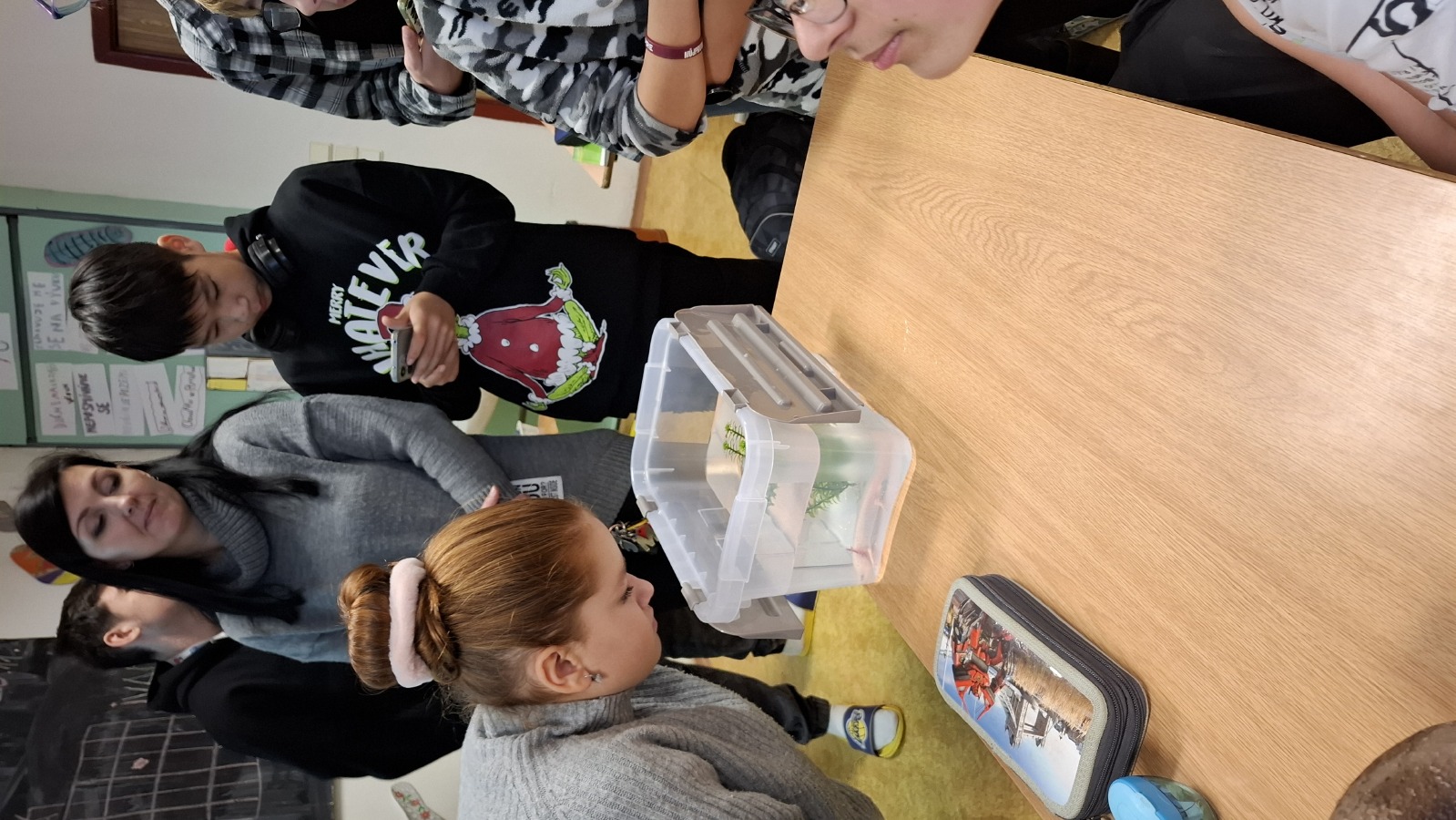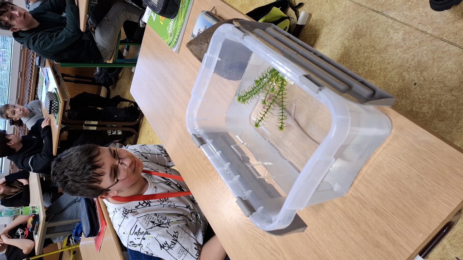 Hodina přírodopisu ve třídě 7.C byla tento týden opravdu výjimečná! Paní asistentka Monika Kuželová nás překvapila návštěvou svého domácího mazlíčka – axolotla mexického. Žáci měli jedinečnou příležitost tohoto fascinujícího obojživelníka vidět na vlastní oči.