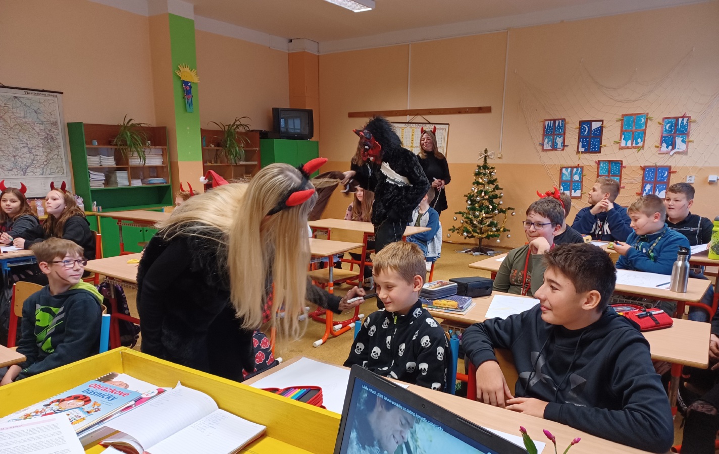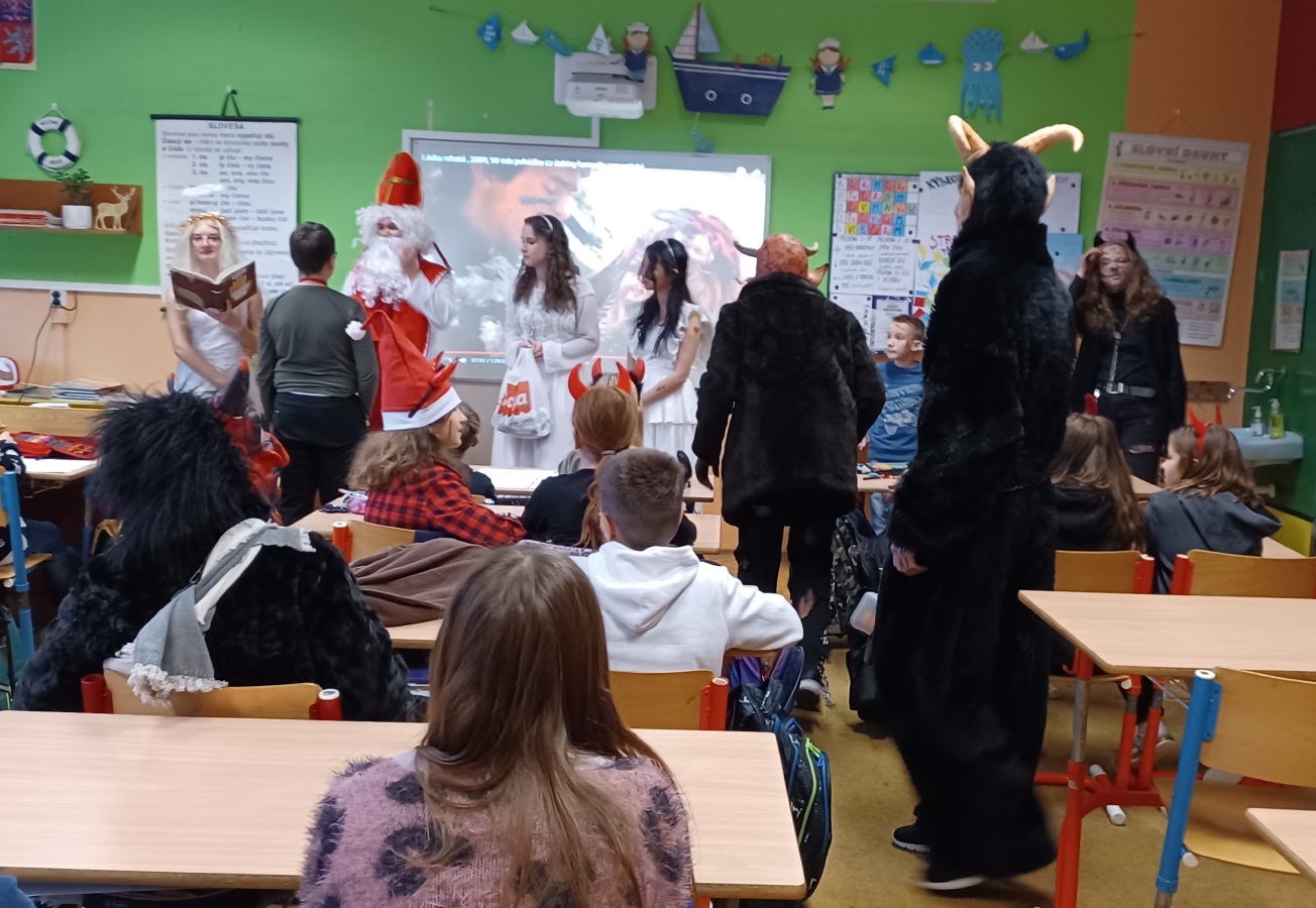 Do třídy nás přišel navštívit Mikuláš se svými pomocníky.