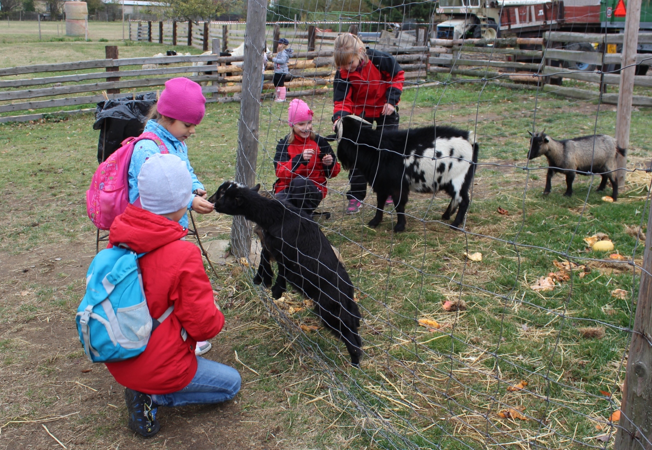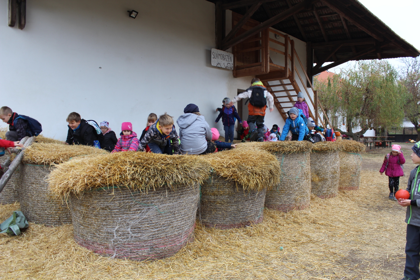 Prošli jsme stodolou plnou dýní různých tvarů a barev, některé jsem si zakoupili. Ochutnali jsme dobroty z dýní. Podívali jsme se na stavby z dýní a na to jaká zvířátka na statku žijí. Viděli jsme slepičky, husy, prasátko, telátko, kozy a malá kůzlátka, ovečky s jehňátky a nakonec i poníka. Vyřádili jsme se ve slámovém bazénu, na houpačkách, slámových hradech a v bludištích.