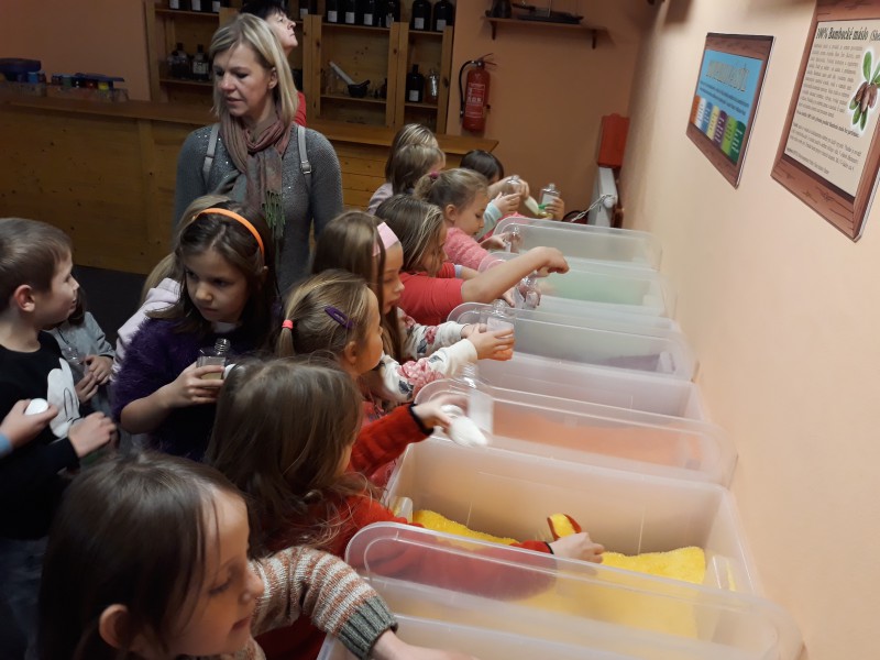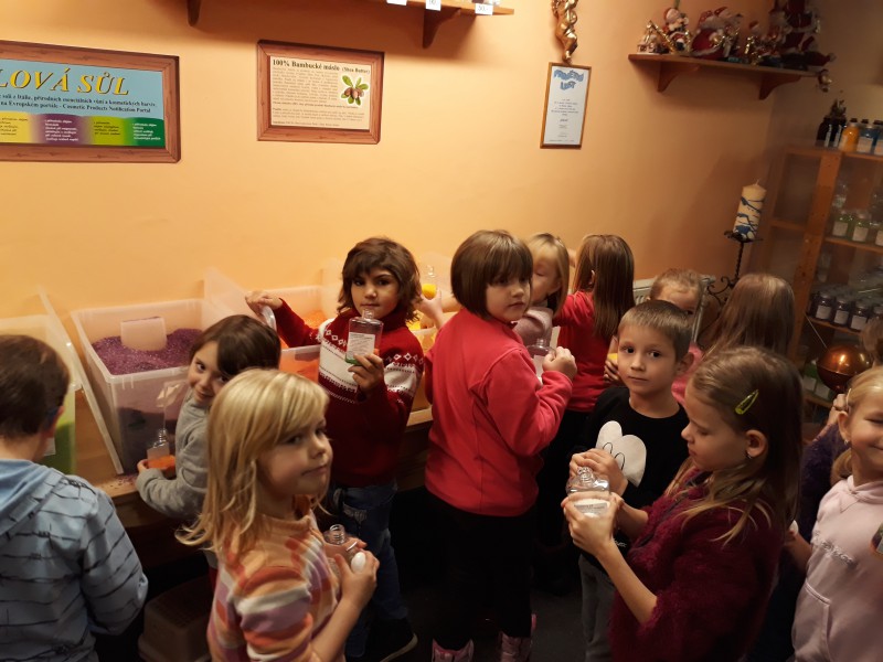 Ve svíčkárně se všem moc líbilo, děti si samy vyrobily spoustu různých výrobků. Namáčely si svíčku v barevném vosku. Do ořechových skořápek si zkusily nalít rozehřátý vosk a tak si vyrobily vánoční plovoucí svíčku. Samy si vykrojily glycerinové mýdlo a naplnily lahvičku vonnou koupelovou solí. Pomohly Ježíškovi nakoupit dárky pro rodiče a na závěr celé exkurze si prohlédly malou domácí farmu umístěnou v areálu svíčkárny.