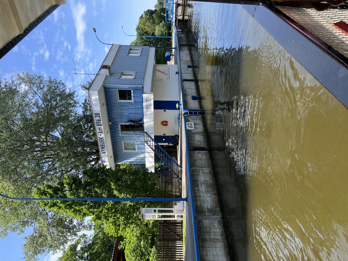 Hodinu proto, že rychlost plavby byla cca 5 uzlů (cca 9 km/hod.). Uzel je definován jako jedna námořní míle . Cestou jsme si vyzkoušeli a viděli v praxi zdymadlo na překonávání rozdílné výšky hladiny řeky před a za splavem.