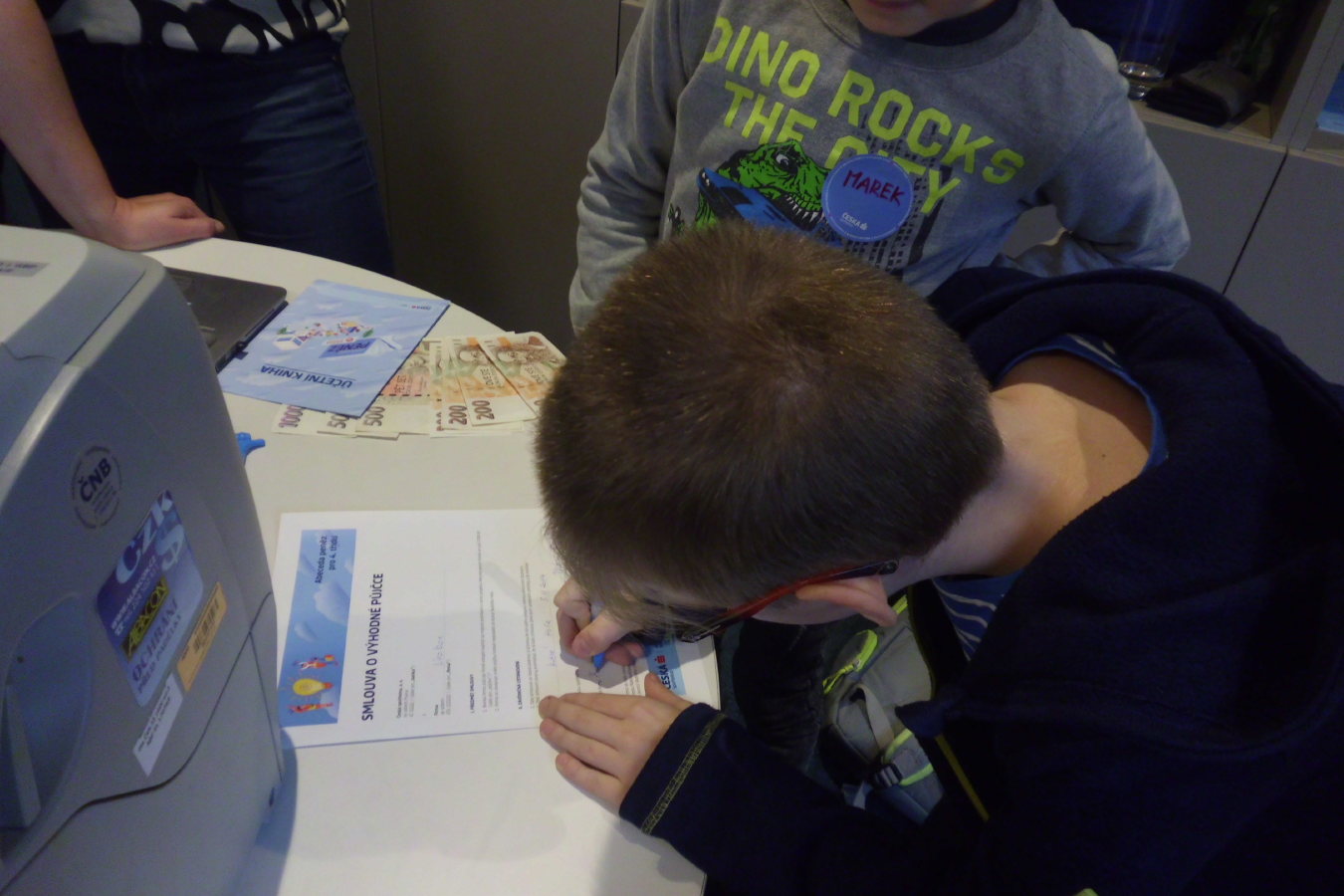 Povídali jsme si o mincích a bankovkách, vysvětlily jsme si, co je to např. rozpočet. Viděli jsme "v akci" počítačky peněz. Podívali jsme se do místnosti s bezpečnostními schránkami a dokonce se spojili i s videobankéřem. Vyzkoušeli jsme si, jak se mění PIN, vybírá či vkládá hotovost do bankomatu.