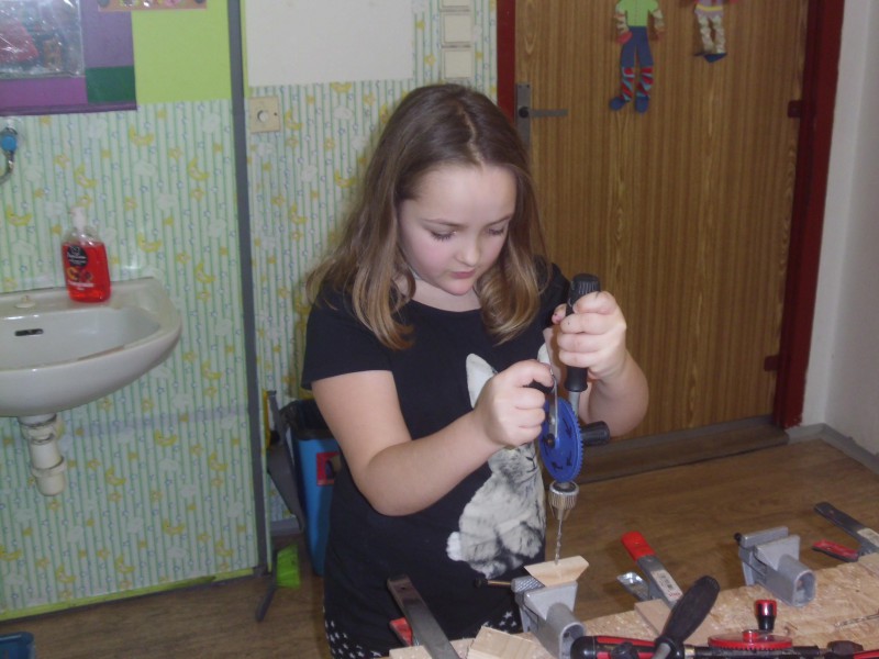 A tak jsme se seznámili s nářadím a hlavně vyzkoušeli, co se s ním vlastně dělá. Pilovali jsme, řezali, vrtali, zatloukali... a dílo se podařilo!