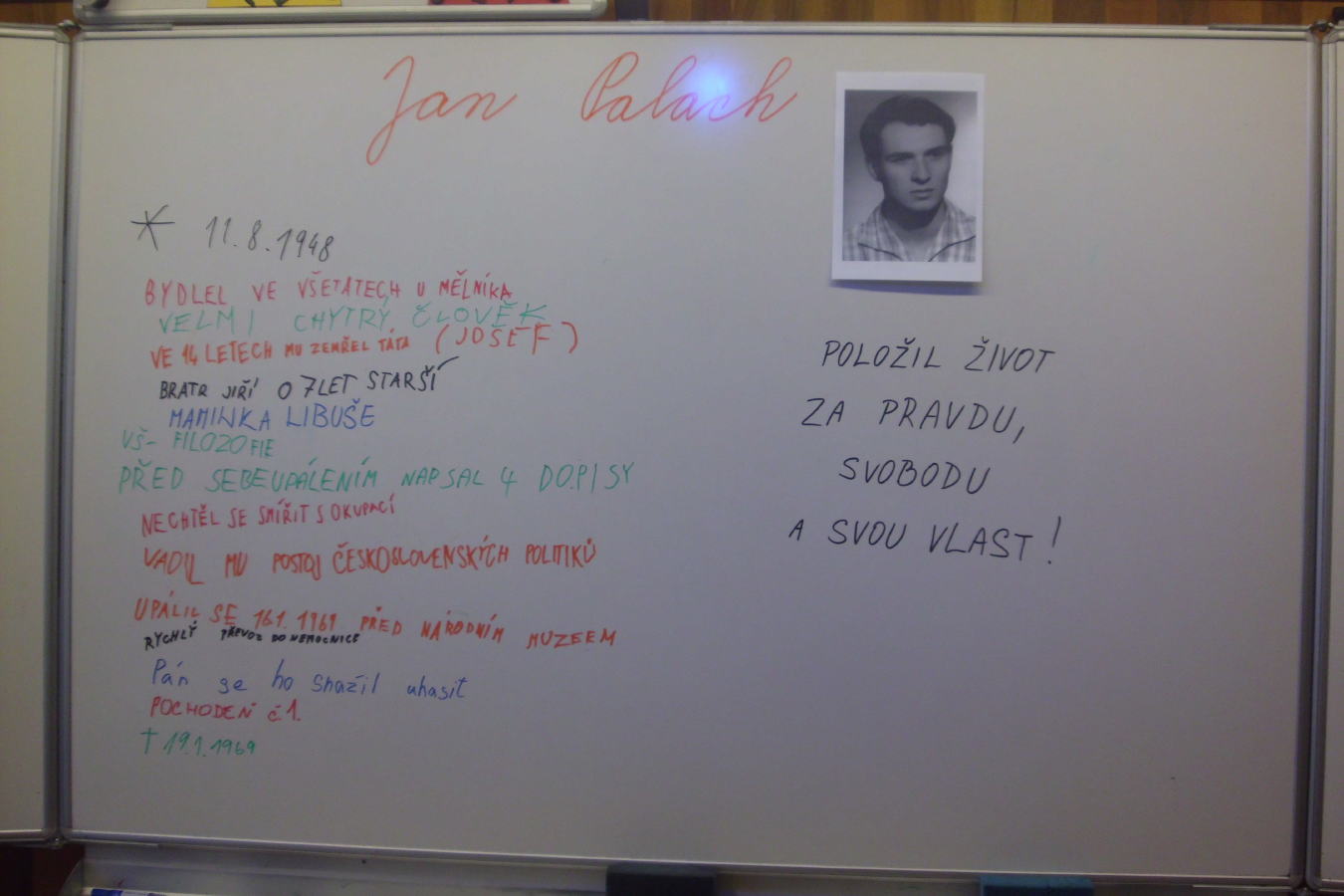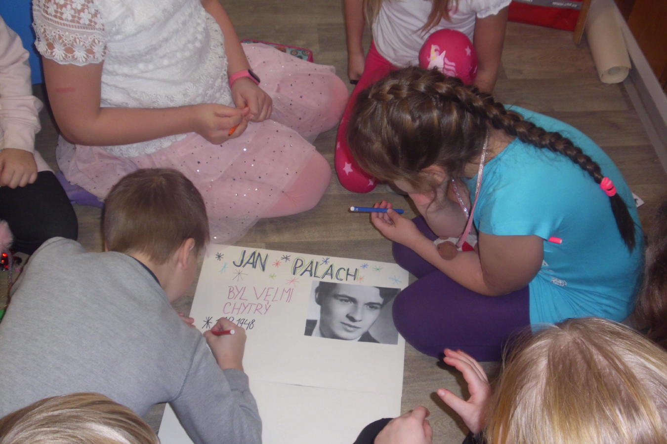 Na závěr jsme všechny nově nabyté informace shrnuli, přidali jsme fotografie a obrázky, které děti nakreslily a vytvořili jsme tak a uctili "vzpomínku na Jana Palacha".