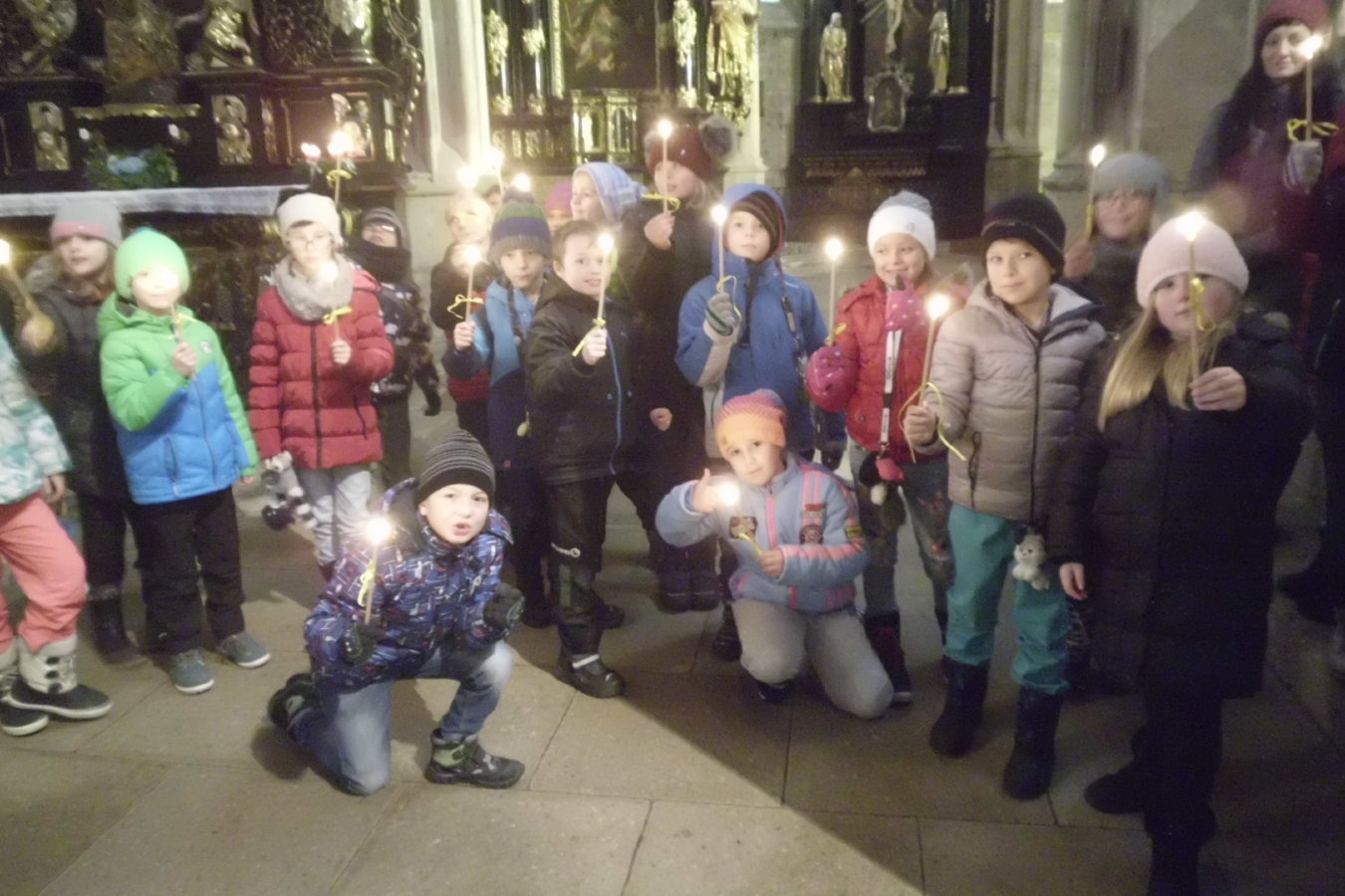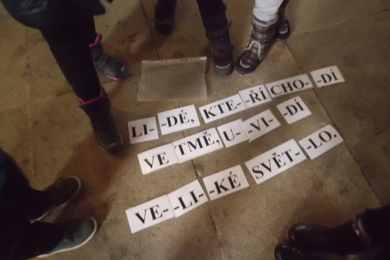 Rozdělili jsme se do 3 skupin a prvním úkolem bylo složit ze slov citát: "Lidé, kteří chodí ve tmě, uvidí veliké světlo." A téma "světla" nás provázelo celým programem. Hledali jsme, kde všude světlo je, co nám přináší, jeho poselství... Poslechli jsme si pověst o sv. Barboře. Hráli jsme si na detektivy... a pátrali po Ježíši Kristovi. Symbolicky jsme zapálili svíce na adventním věnci.