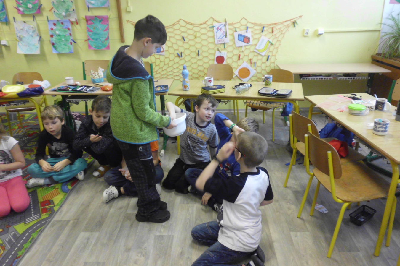 Hned ráno jsme se pustili do práce. Rozdělili jsme se do předem určených skupin a každá z nich vytvořila jeden druh nepečených kuliček. Vzájemně jsme ochutnali, přidali ještě cukroví od maminek a uvařili si k tomu dobrý vánoční čajíček.