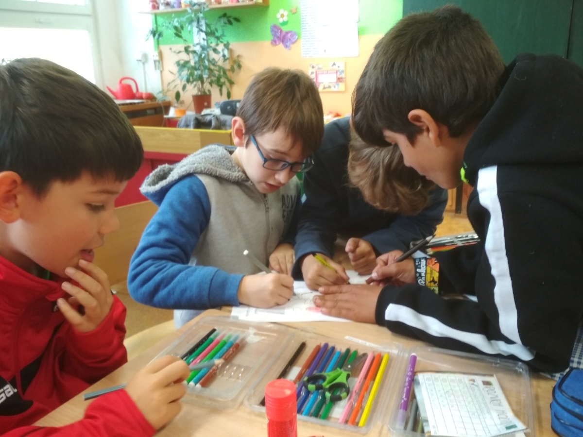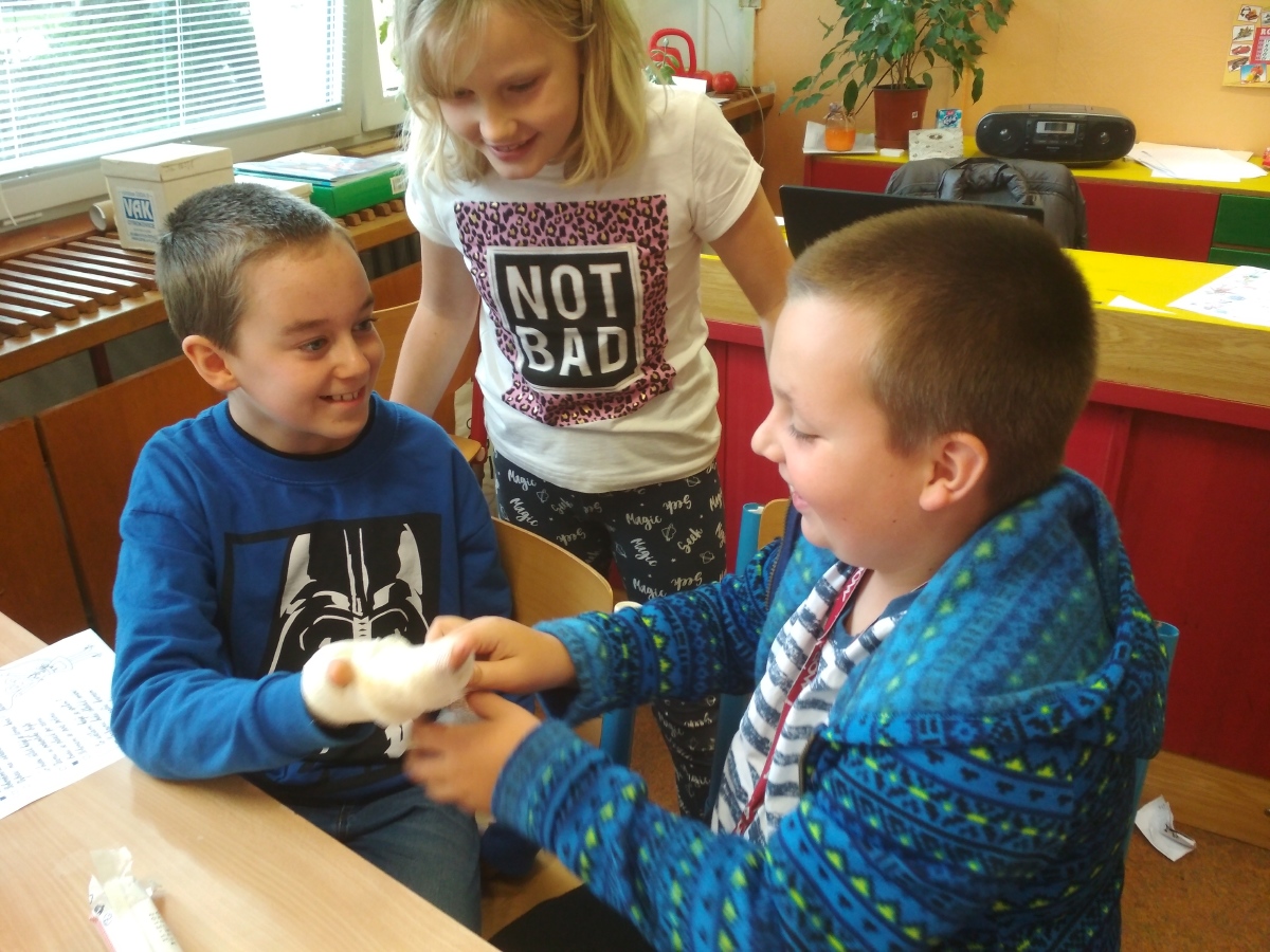 Po cvičné evakuaci školy se žáci IV. B vrátili zpět do třídy, kde se rozdělili do několika skupinek. Každá skupinka měla za úkol rozhodnout, jaké pomůcky potřebuje hasič ke své práci, jaký typ hasicího přístroje se používá na dané předměty (elektrická zásuvka, benzin), co si zabalit do evakuačního zavazadla apod. Žáci si také zopakovali, jaký je postup ohlášení mimořádné události, vyzkoušeli si ovázat poraněnou hlavu či ruku svému spolužákovi.