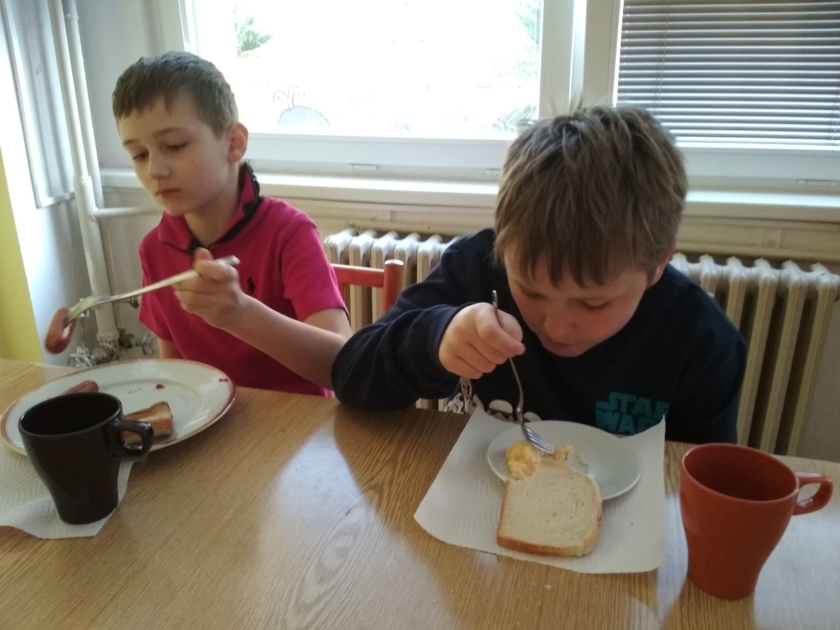 Bohatá snídaně zahrnovala smažená vajíčka, párečky, opečené toasty, marmeládu, máslo, čaj i pomerančový džus a další dobroty. Děti si na snídani nejen pochutnaly, ale také se naučily mnoho nových slovíček. Chvílemi i zapomněly zlobit, protože měly boule až za ušima! ![]()