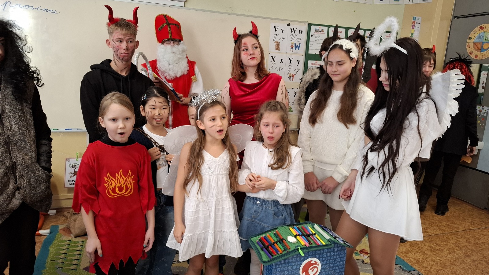 Podle důkladného sčítání se nakonec žádný zlobivec čertům do Pekla nedostal, a tak jsme se všichni v pořádku dostali na začátek dalšího týdne. Tentokrát však třída 9.B připravila pro školu něco zcela speciálního – týden naruby ! Co nás čeká? To se teprve uvidí, ale rozhodně se máme na co těšit!