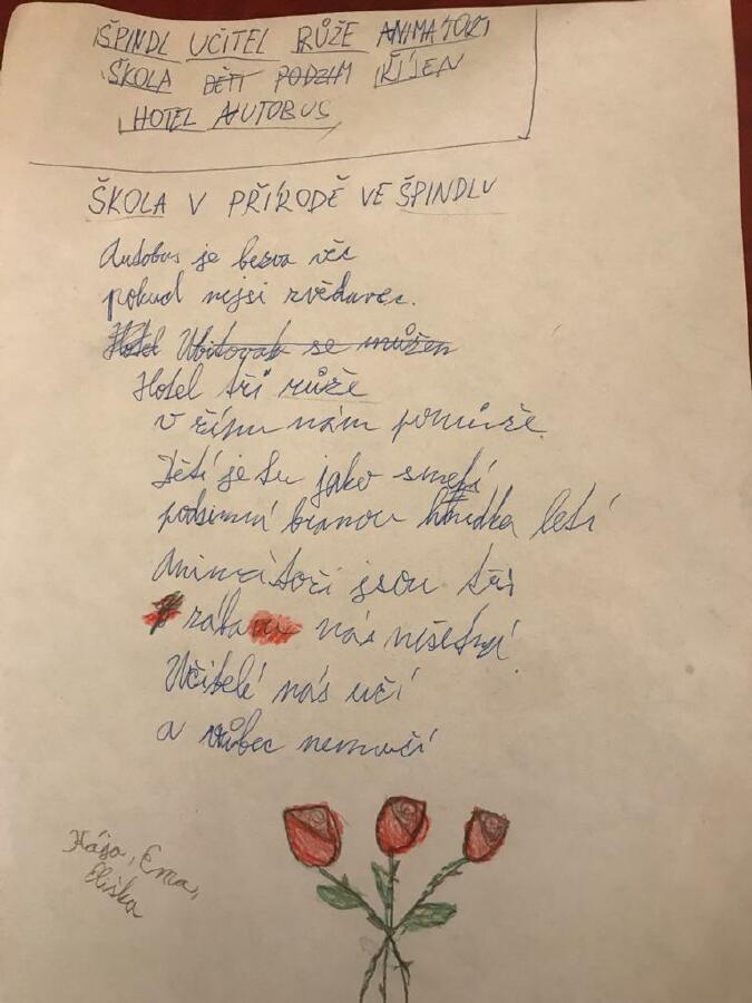 Konečně jsme mohli vyjet na dlouho plánovanou školu v přírodě do Špindlerova Mlýna. V Hotelu Tři růže nás přivítali usměvaví animátoři a vstřícný personál. Po ubytování a obědě jsme zahájili KOUZELNÝ PROGRAM, který nás bude provázet až do konce pobytu