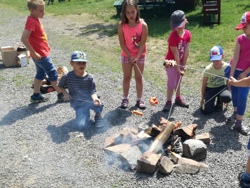 Děti se také proměnily na kuchaře a připravily si oběd. Na opékací jehly si navlékaly dobroty podle své chuti a špízy si pak opekly na ohýnku. Samozřejmě, že všem báječně chutnalo!