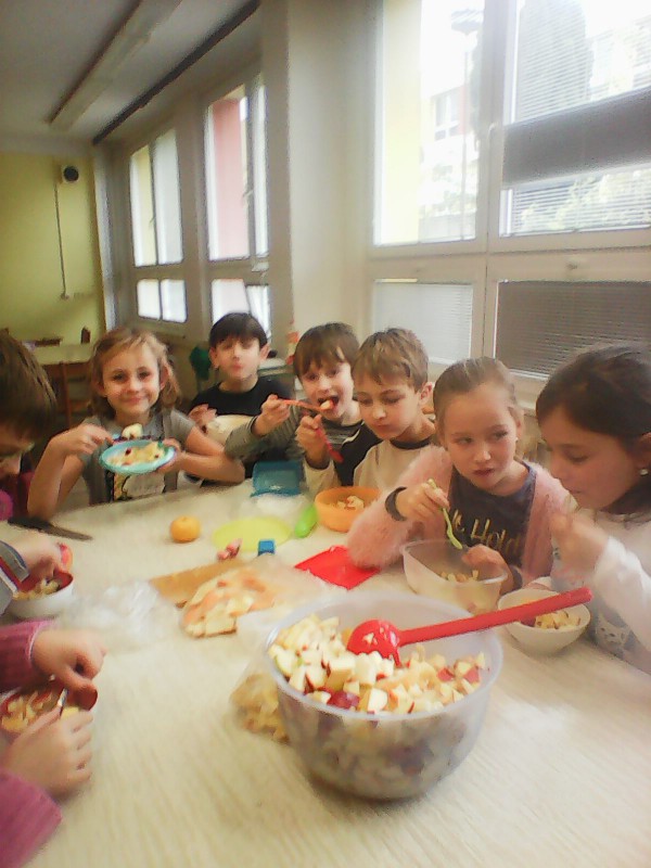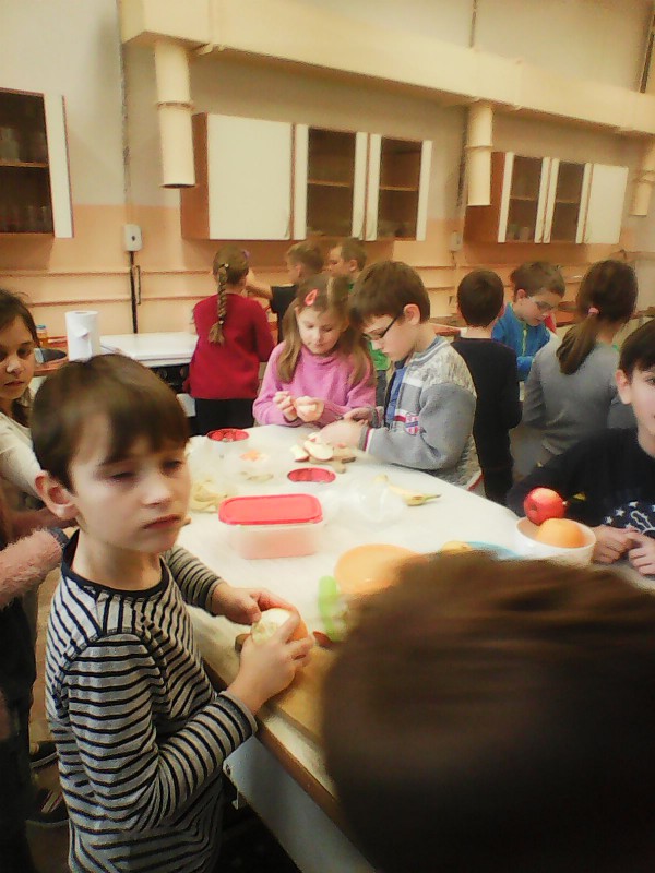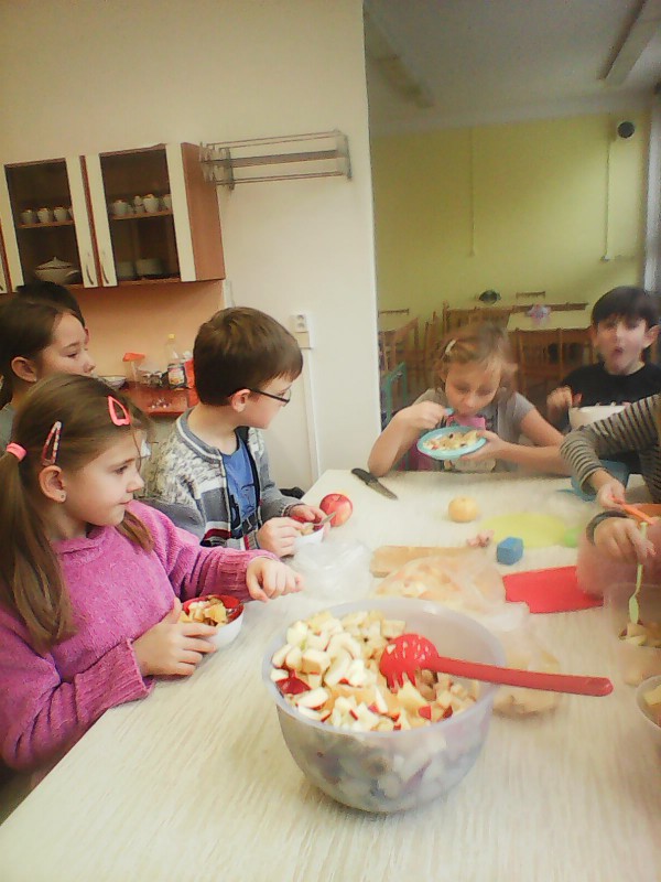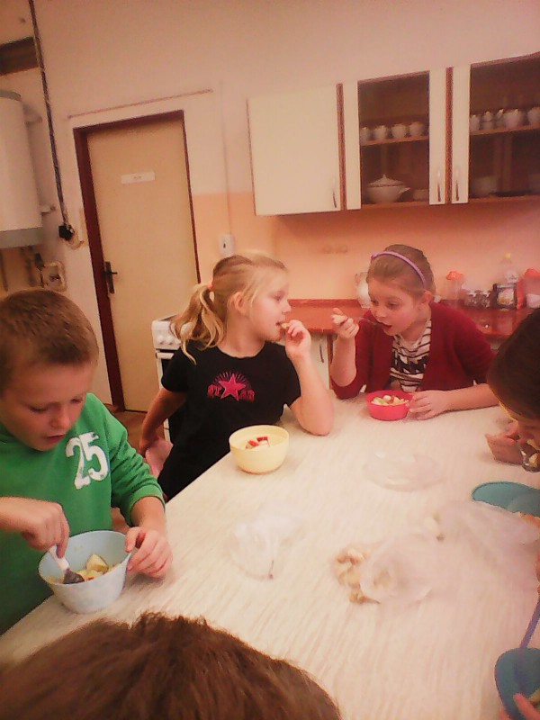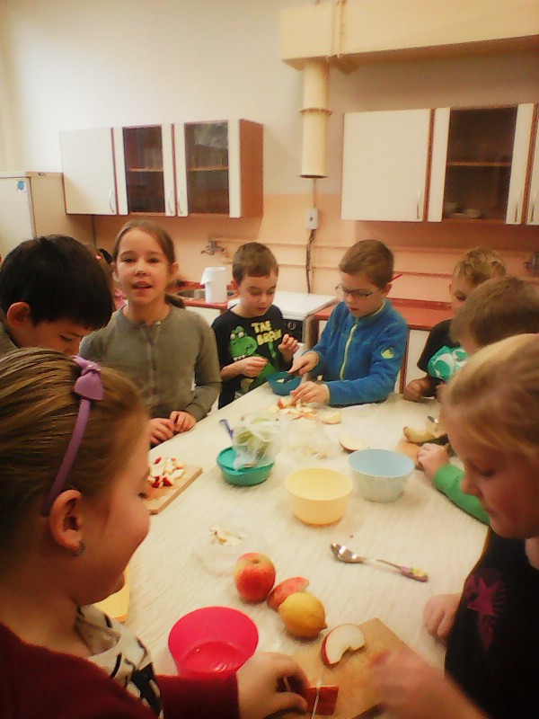 V době podzimních plískanic a chřipkových onemocnění jsou vitamíny pro naše tělo velmi důležité, takže jsme se rozhodli, že si uděláme výborný ovocný salát. 8.11. jsme se přesunuli s připravenými surovinami do školní kuchyňky a dali jsme se do práce. Velmi dobře nám šlo krájení (nikdo se nepořezal), míchání a hlavně pojídání ovocné dobroty. Stihli jsme si zopakovat zásady správného stolování a nakreslit si obrázek s oblíbeným jídlem. Někteří se v kuchyňce cítili "jako doma", tak se tam třeba zase někdy podíváme ...