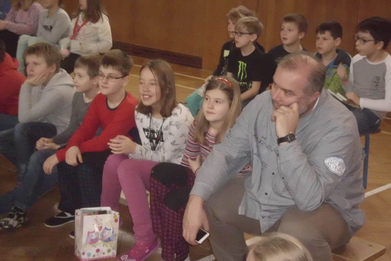 Také žáci III. B si náramně užili hudební show zpěváka a baviče Vládi Hrona. Poslouchali a zpívali, tleskali a pohupovali se do rytmu.