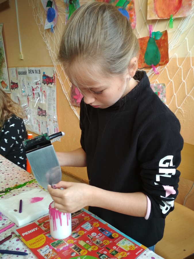 V pátek 1. 11. zavítala do třídy IV. B paní Olga Šedová, která ovládá úžasnou výtvarnou techniku zvanou enkaustika neboli malování horkým voskem. Pomáhala žákům vytvořit krásné pestrobarevné svíčky a přáníčka, které bude možné zakoupit na Jarmarku Abecedy peněz v prosinci. Ve fotogalerii si můžete prohlédnout, jak se svíčky žákům povedly! ![]()